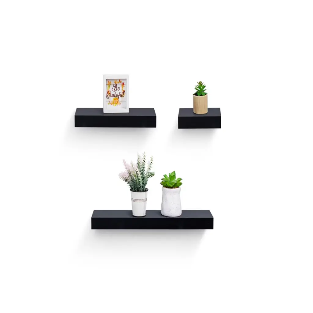 These floating shelves offer stylish storage to display items and provide practical space, maximize space without extra floor area, work in various rooms like bedrooms or kitchens, have multiple functional uses for storage and decor, and come with included hardware for simple installation.