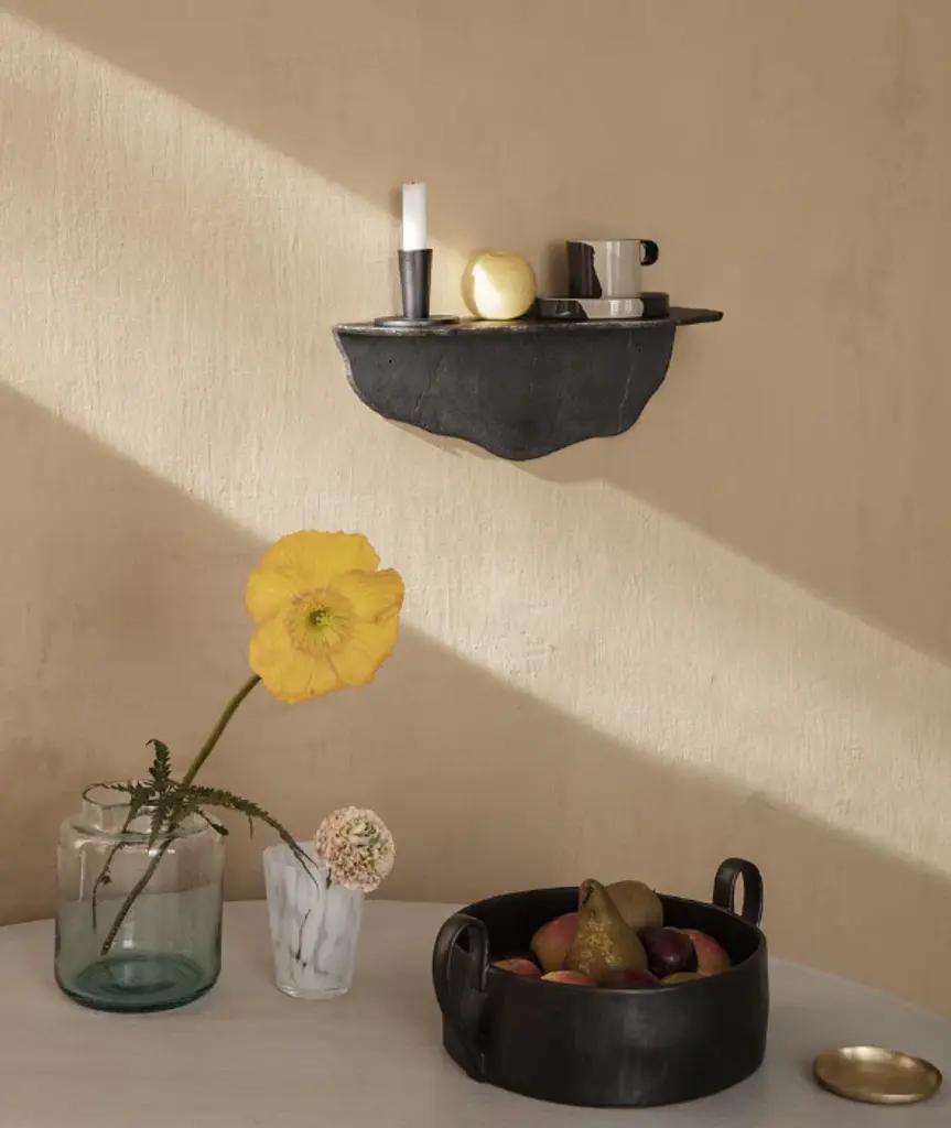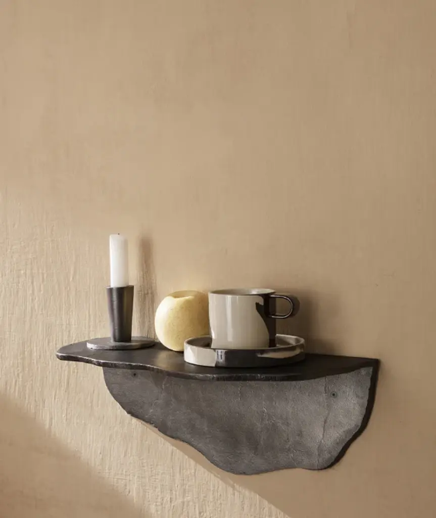 Made from 100% recycled aluminum, this casted, decorative and functional shelf embraces the rough and jagged look of the material, with the casted metal finish mirroring the appearance and texture of fractured natural stone. The Fracture Shelf can be hung in two directions, so that you can decide on its final expression.