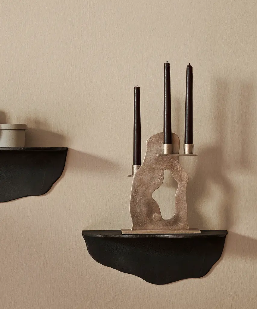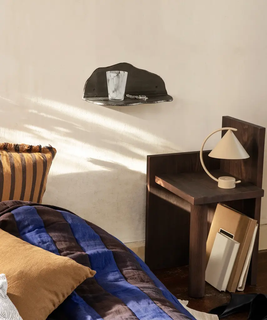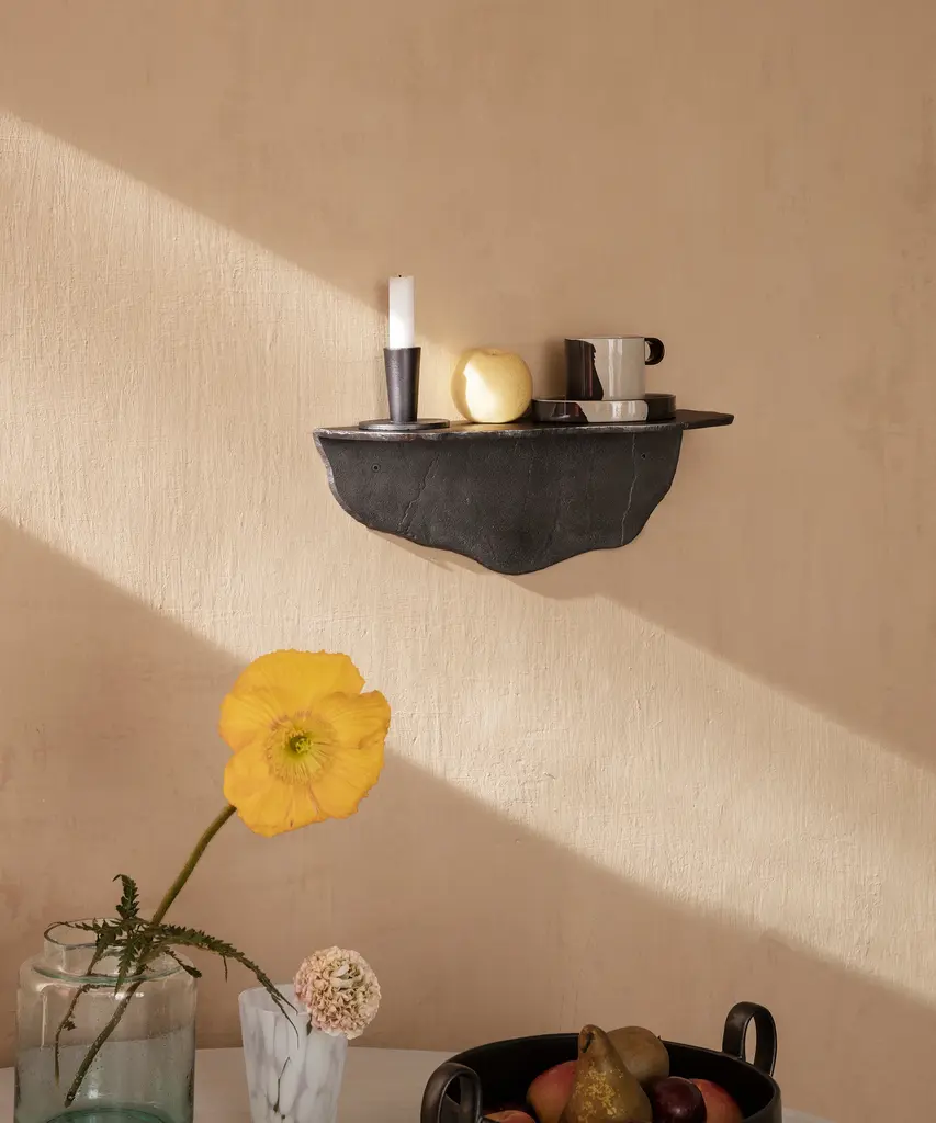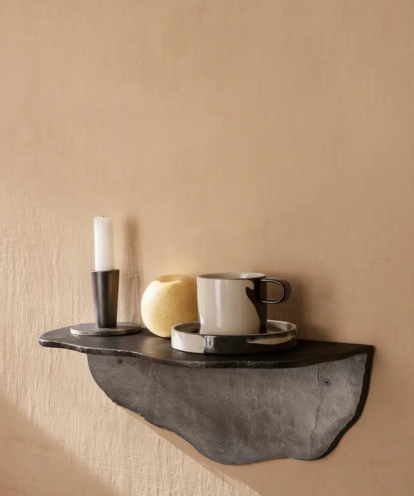 Made from 100% recycled aluminum, this casted, decorative and functional shelf embraces the rough and jagged look of the material, with the casted metal finish mirroring the appearance and texture of fractured natural stone. The Fracture Shelf can be hung in two directions so that you can decide on its final expression. Designed and produced by the Copenhagen-based studio Ferm Living.