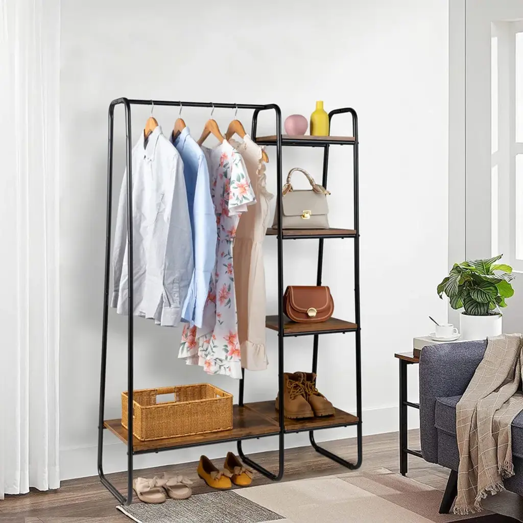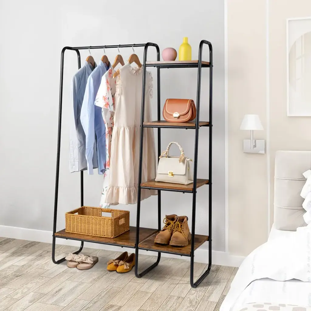 Freestanding Clothes Rack With 5 Wood Shelf - N/a - Brown & Black