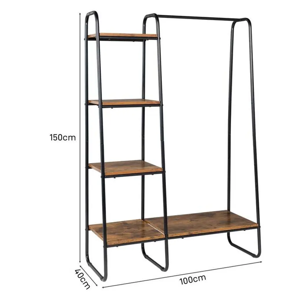 Introductions:1. [Clothes storage rack]:equipped with 5 shelves, can store all kinds of clothes, such as shirts, tops, jackets, pants, even shoe bags, suitcases and other accessories. Add more space for your needs.2. [Independent portable wardrobe]: vintage wardrobe, suitable for small wardrobe, making small space more practical. Easily transport your own wardrobe. The foot pad can be fine tuned on uneven ground. If you have enough space, you can even buy multiple clothes to create a perfect wardrobe effect3. [Multi function storage rack]: The compact design is the ideal choice for any place in your home, and you won't worry about taking up space. Or as a commercial clothing rack in a clothing store.4. [Easy to assemble]: assembly is very simple. We are equipped with all installation tools and instructions for installation steps.5.[3-IN-1 multi-function closet rack] The independent corner wardrobe organizer combines a clothes pole and a storage rack, saving space, while providing your home with a lot of storage space to keep your room clean and orderly! It can be used in different places, such as bedroom, living room, cloakroom, laundry walk-in wardrobe, etc.features:1. Made of high-quality materials, stable, durable2. Long service life3. Large storage capacity makes your room no longer messy4. Spacious and adjustable, multi-functional and practical5. Easy to assemble and maintainSpecifications:1. Material: MDF metal2. Color: Black&Brown Or White&Oak3. Size: (39.37 x 15.74 x 59) "/(100*40*150) cm (L x W x H)Package includes:1 x Clothing rackNote:Confirm whether the storage space in the home matches before placing an order