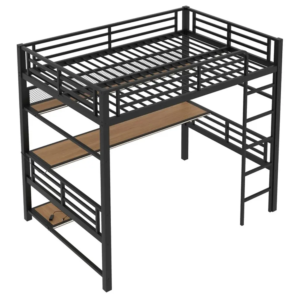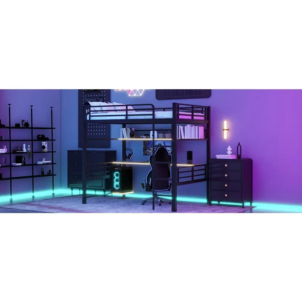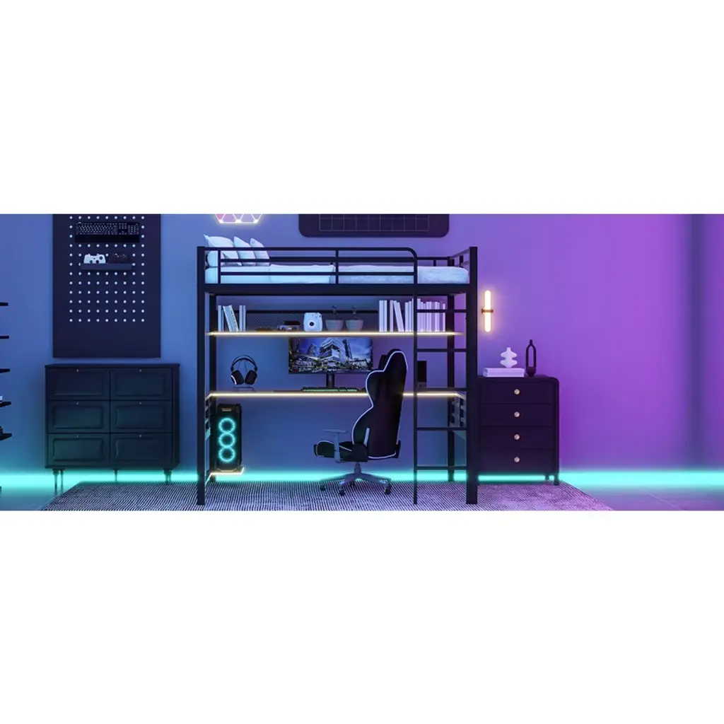 Full Size Metal Loft Bed With Storage Shelf And Led Light
