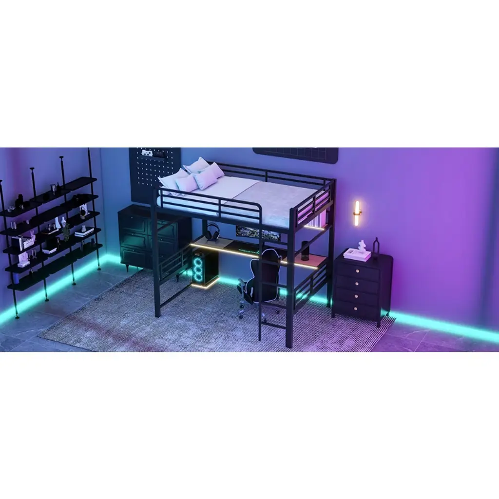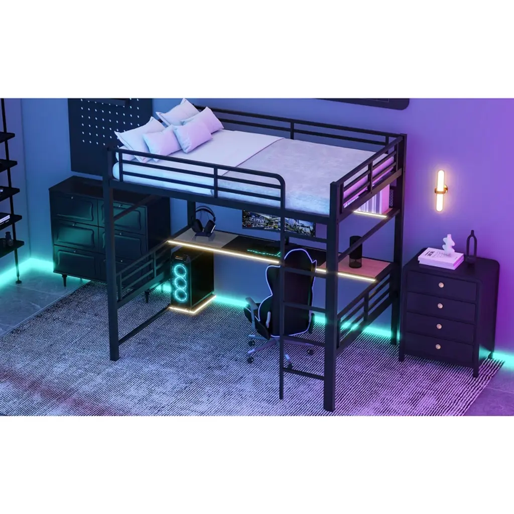 Product Features [Loft Bed with Desk and Shelves] This full-size metal loft bed integrates a built-in functional desk, 1 large storage shelf, 1 dedicated computer host shelf, and convenient LED lights—all designed to maximize space and functionality. The under-bed area offers ample clearance, allowing you to transform it into a clever workstation for gaming or studying, a cozy reading nook, or a creative craft area. Both the large desk surface and the storage shelves are crafted from thickened MDF board, which enhances weight capacity, easily supporting gaming monitors, laptops, books, or decor without warping or instability.[Safety Guaranteed] The upper sleeping area of the loft bed is fully surrounded by full-length raised guardrails. These guardrails are tall and securely attached to the frame, effectively preventing accidental falls even when you toss, turn, or shift positions during sleep. This thoughtful design creates and maintains a safe sleeping space, giving you and your family peace of mind—especially for younger users or gamers who may move around more on the bed.[Cool & Smart LED Light] The full-size loft bed comes with a remote-controlled LED light system, offering several vibrant color options to choose from (e.g., warm white, cool blue, bright red, soft purple). You can easily adjust the light color via the remote to match your mood: use a dynamic hue for intense gaming sessions, a calm tone for reading, or a cozy glow for bedtime. This LED light adds a dreamy, modern touch to your bedroom decor and blends seamlessly into any small living space, elevating the overall atmosphere.[Ample Storage Space] This loft bed is equipped with multiple storage solutions to keep your space tidy. It includes 1 large storage shelf (ideal for files, books, or decorative items) and a DIY iron mesh panel—perfect for hanging headphones, keys, hats, T-shirts, or bags to keep frequently used items within reach. Additionally, there’s a small dedicated storage shelf under the desk, designed specifically as a computer host stand to keep your gaming PC or desktop tower organized and off the floor. Together, these storage features provide plenty of under-bed space to reduce clutter.[Easy to Assemble] All parts, hardware, and accessories included in the package are clearly labeled with numbers or symbols, avoiding confusion during assembly. The package also comes with a detailed, step-by-step installation manual that includes simple instructions and clear diagrams, plus pre-drilled holes on all panels to ensure accurate alignment. Even if you have no prior assembly experience, you can easily put the bed together individually. Description Material: Metal (frame, guardrails, bed slats, iron mesh, and shelf frames) + MDF (desk surface and storage shelf panels)Size: Full (fits standard full-size mattresses, no custom sizing required)Numbers of Package: 2 (parts are split into 2 manageable packages for easier shipping and handling; both packages arrive together)Spring Box: No need (the heavy-duty metal slat system provides sufficient support for the mattress, eliminating the need for an extra foundation)Assembly Required: Yes (all tools, labeled parts, and a step-by-step manual are included for hassle-free self-assembly)Overall Product Dimension: 77.6''L x 54''W x 72.4''H (compact footprint to save floor space, with enough height for the under-bed desk and storage)Bed Dimension: 75'' x 54'' (standard full-size dimensions, ensuring a perfect fit for most full-size mattresses)Total Height: 72.4'' (provides ample under-bed clearance for comfortable use of the desk and storage, while keeping the upper bed easy to access)