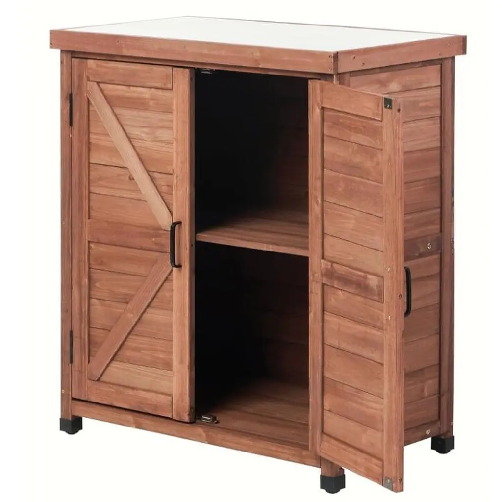 Garden Potting Bench Table, Fir Wood Workstation With Storage Shelf, Drawer And Cabinet - Brown