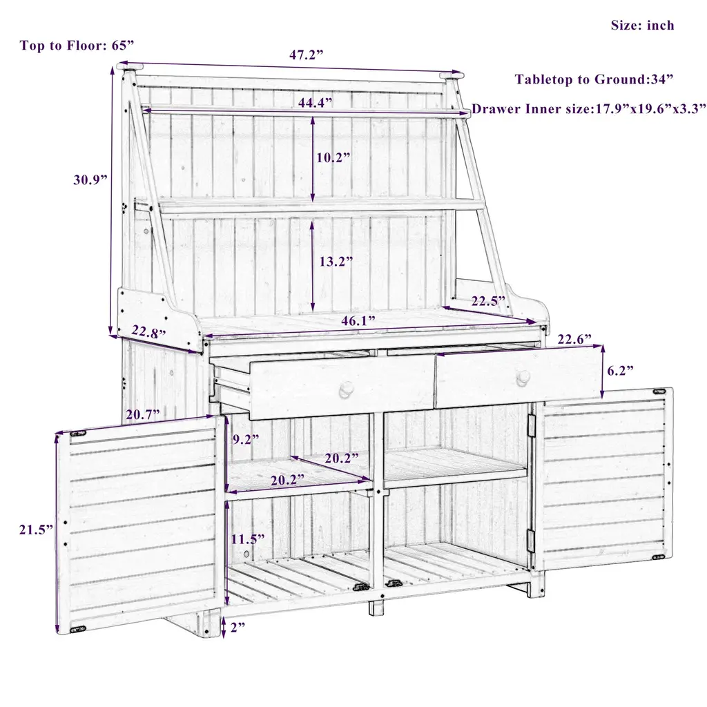 Product Features[Durable Construction and Quality] Made of 100% fir wood and featured with two triangle bars, its strong and sturdy construction ensures more stability, even when loaded with heavy pots and garden equipment. 2 anti-falling devices fix the bench for better safety. Besides, the cabinet door is equipped with magnetic, providing a more silent and soft click while latching or closing, efficiently preventing dust and insects entering, and leading to longer lifespan for[Organized Storage] The three-tier shelves is perfect to showcase your favorite plantings, flowers or place some tools on it. The table comes with two spacious drawers, one cabinet with double shelves, as it provides ample storage space to separate different types of items into specific compartments, keeping everything well-organized and within reach.[Dimensions] Overall size: 47.2x22.8x65inch(LXWXH); Tabletop size:46.1x22.5inch(LXW); Each drawer inner size: 17.9x19.6x3.3inch(LXWXH). For more size, please refer to the size image.