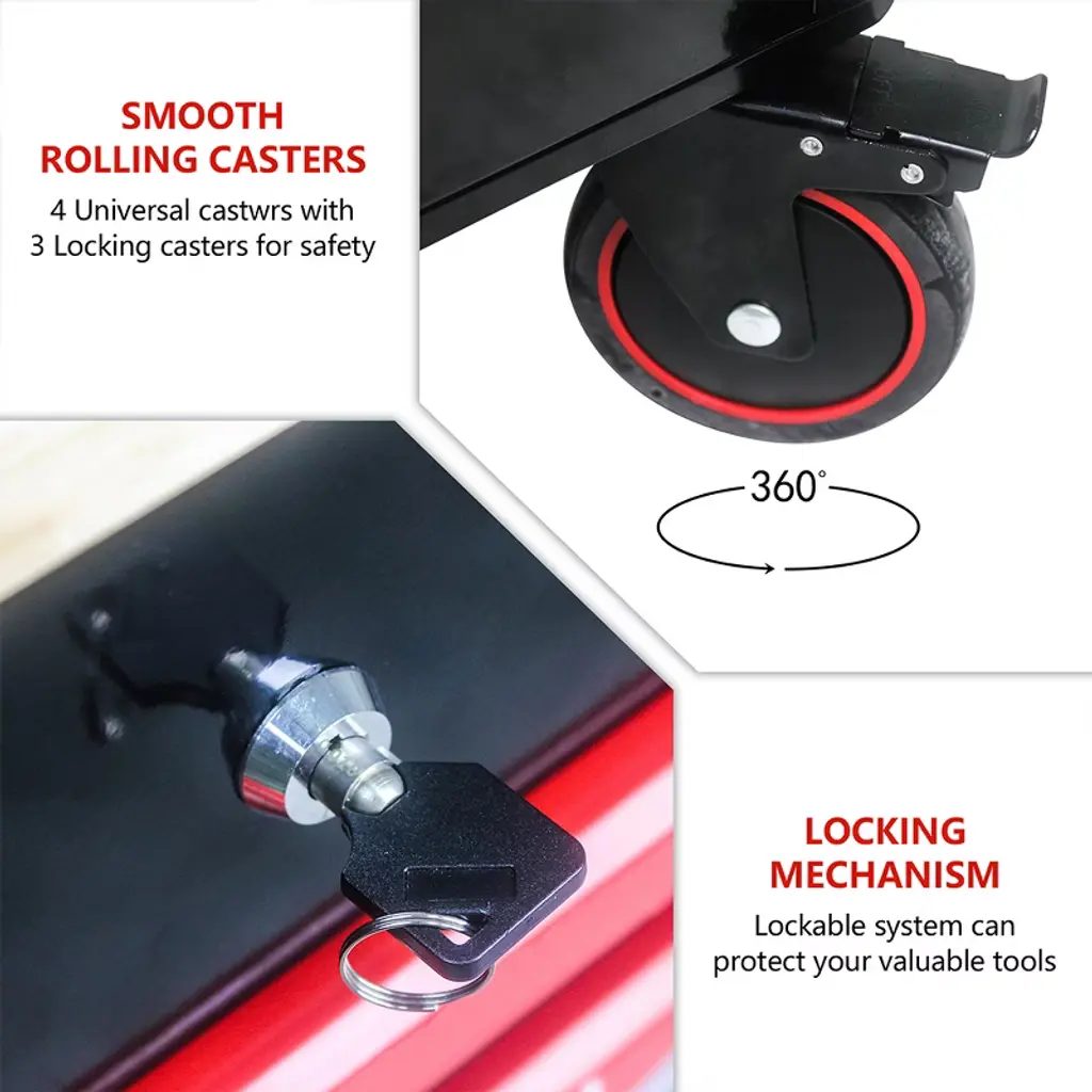 Introducing the Garvee Rolling Tool Chest with Drawers, the ultimate storage solution for your garage, warehouse, or repair shop. This large tool chest is designed to keep your tools organized, secure, and easily accessible, making your workspace more efficient and clutter-free.Crafted with durability in mind, the Garvee Tool Chest features a robust locking system that ensures your valuable tools stay safe. The adjustable shelf allows you to customize the interior space to fit a variety of tools and equipment, providing versatile storage options to meet your specific needs.Equipped with smooth-rolling casters, this tool chest offers effortless mobility, allowing you to move your tools wherever you need them. The sleek black finish not only adds a professional look but also resists scratches and wear, maintaining its appearance over time.Key Features:- Large capacity with multiple drawers for organized tool storage- Adjustable shelf to accommodate different tool sizes- Secure locking system for enhanced safety- Heavy-duty construction for long-lasting durability- Smooth-rolling casters for easy mobility- Stylish black finish that resists scratches and wearWhether you are a professional mechanic, a DIY enthusiast, or managing a busy workshop, the Garvee Rolling Tool Chest is designed to meet your storage needs with style and reliability. Upgrade your workspace today with this premium storage cabinet and experience the convenience and security it offers.