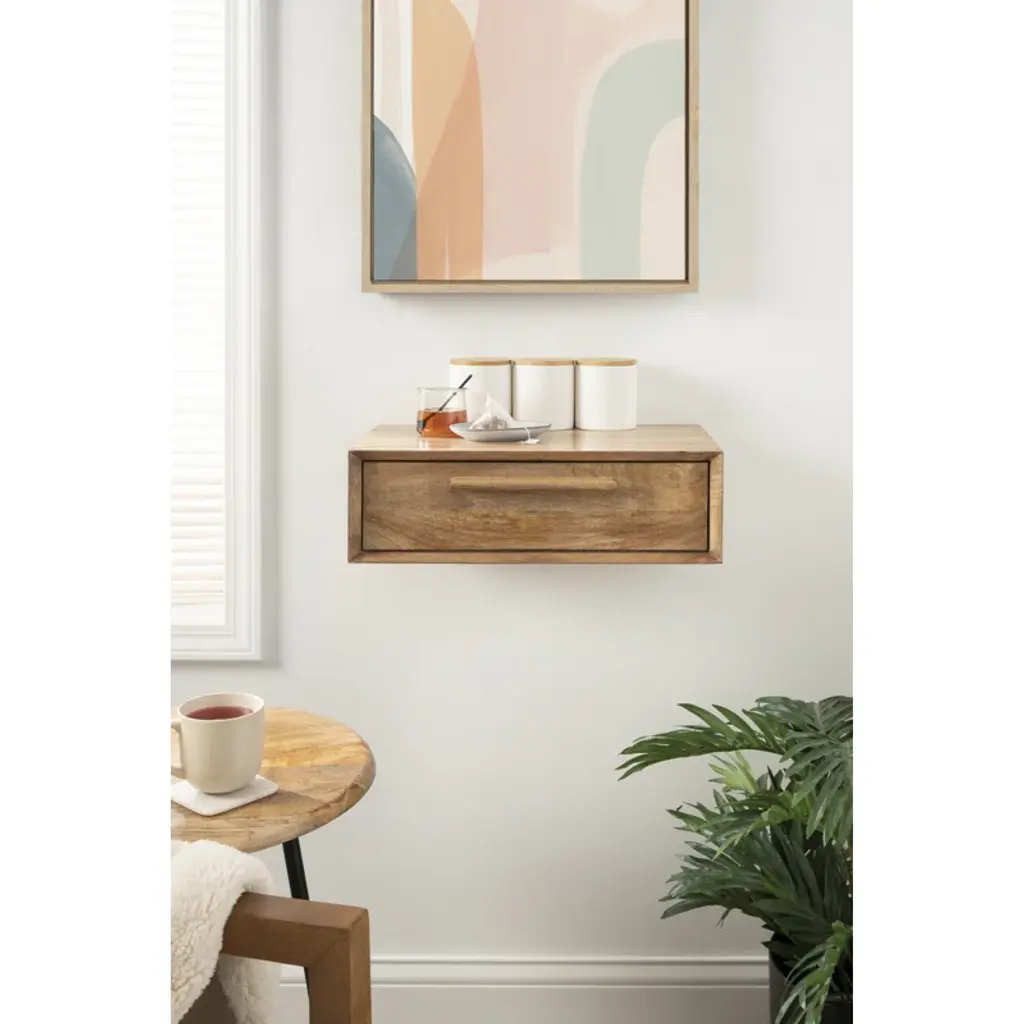 Featuring a convenient storage cubby, this floating wall shelf makes a great nightstand or console table substitute in space-conscious bedrooms or entryways. It’s crafted from solid mango wood with distinctive natural graining. Sturdy metal Z-brackets make installation as easy as styling.