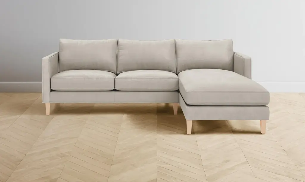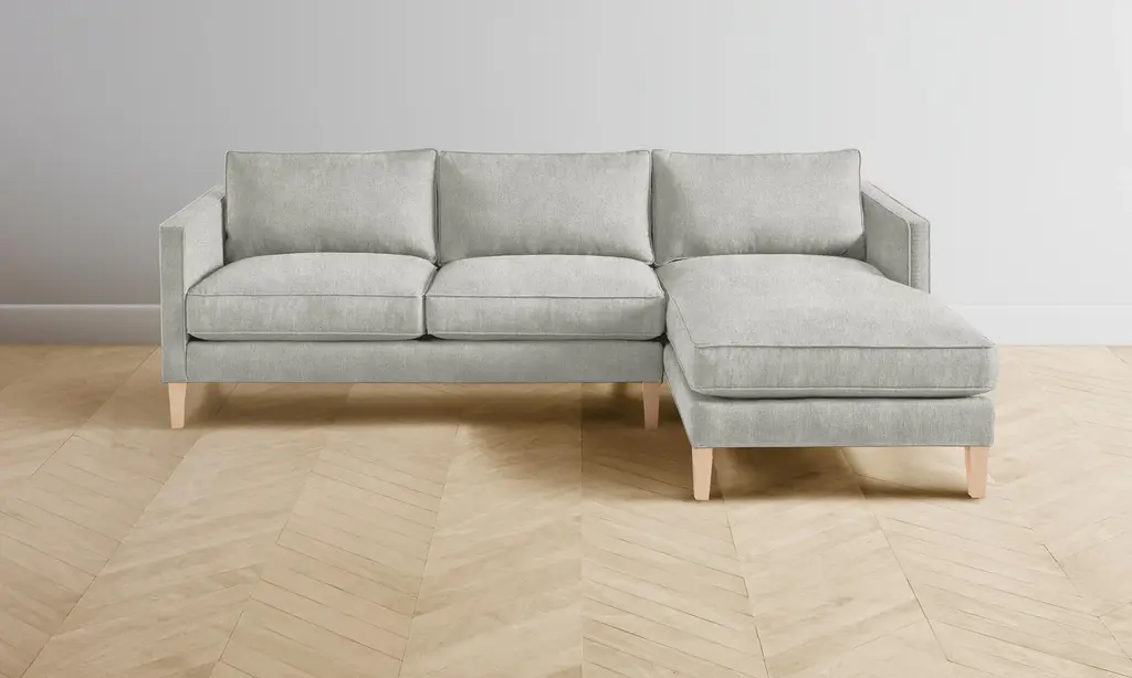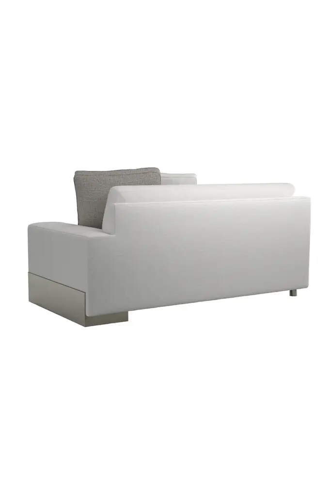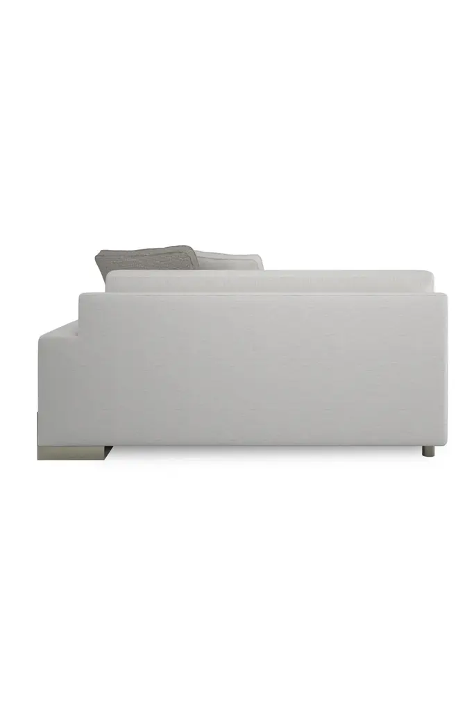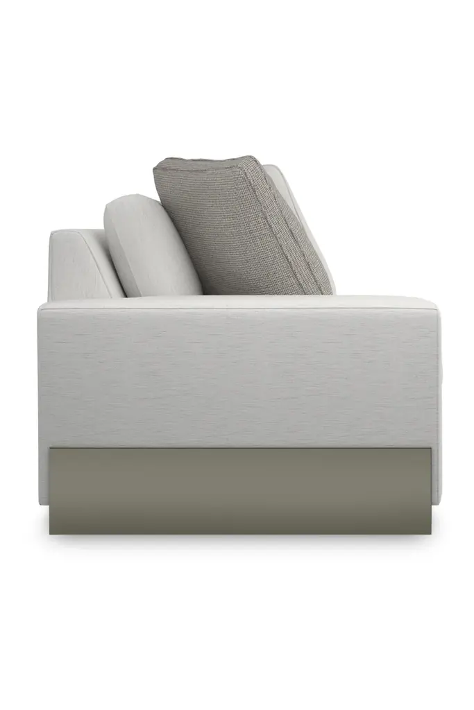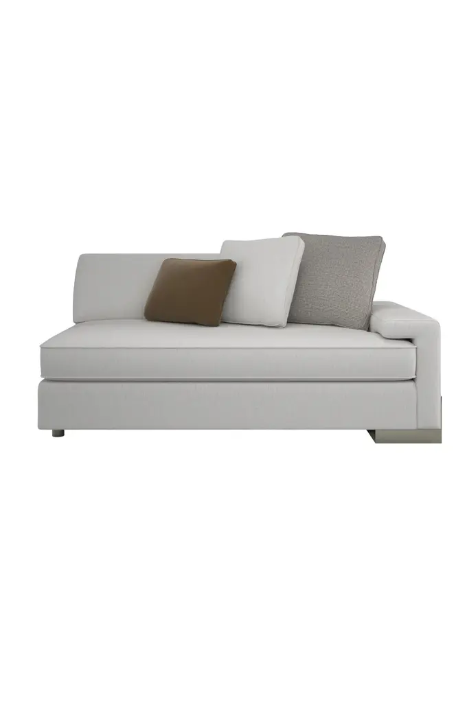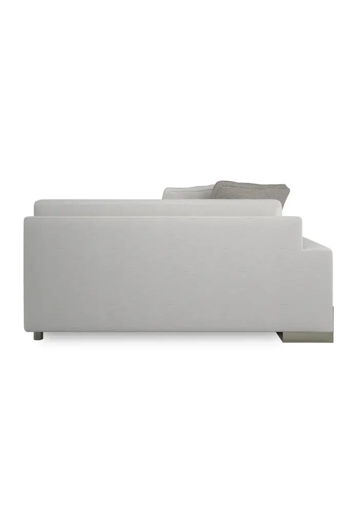 Create a destination in your home with the refined character and comfort of this stunning sectional sofa. Unique by design, its seat cushions nest under a wide shelf-arm creating statement-making style. Destined to be a favorite spot for resting and relaxing, this sectional is upholstered in a neutral, linen-like fabric with a small, modern herringbone pattern. An angular wood base finished in Pyrite cradles the frame and imparts a finishing touch that grounds its design presence.