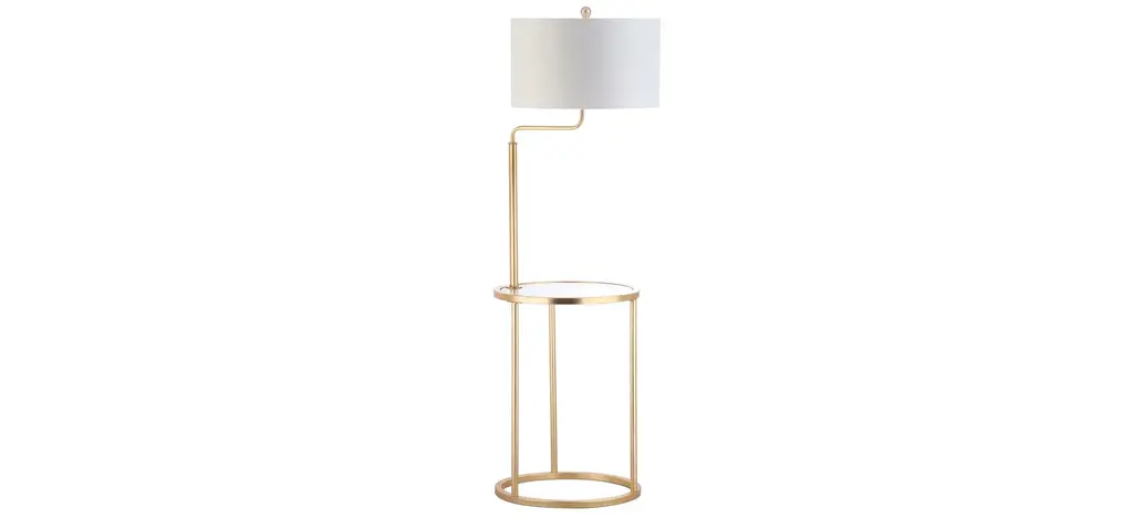 Gretchen 1 Light Round Base Floor Lamp With Shelf, Aged Brass, White Shade
