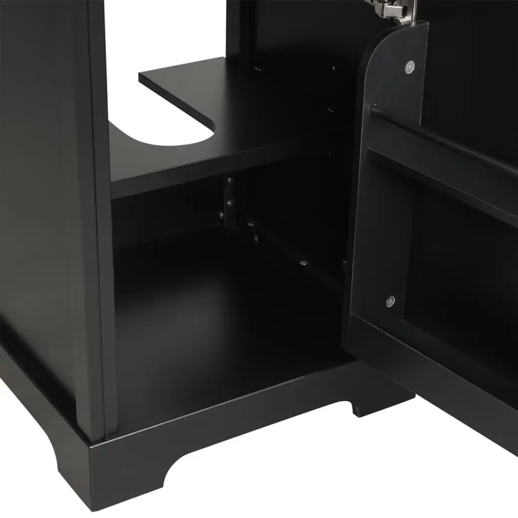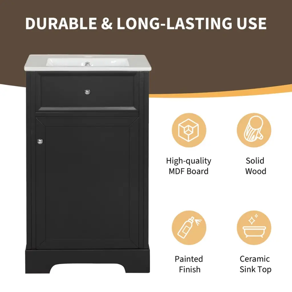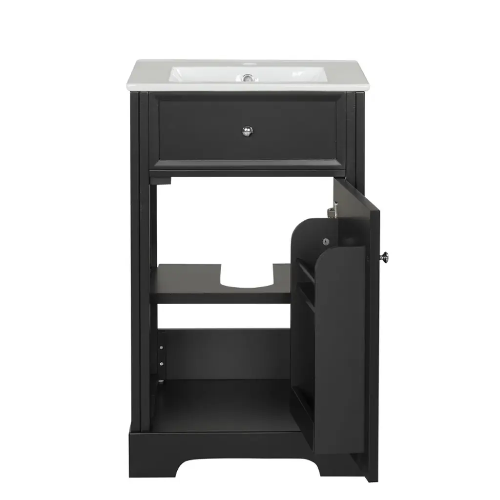 This Gulches bathroom vanity is an ideal choice for any modern bathroom It features a stylish black cabinet with a freestanding design and a robust construction made of high quality MDF board The vanity includes a stunning white ceramic sink top with an undermount drop in design and a center sink location The sink top is equipped with an integrated overflow and a single hole faucet mount The vanity cabinet offers generous storage space with one cabinet door a two tier storage rack on the door and an adjustable shelf The cabinet door features a soft closing mechanism and a round handle for a modern look and easy use Constructed with durable MDF board this vanity supports up to 100 pounds Its compact size and elegant design make it a perfect addition to any bathroom The overall product dimensions are 20 inches in length 18 inches in width and 34 inches in height The cabinet base measures 19 inches in length 17 inches in width and 33 inches in height The sink top dimensions are 20 inches in length 18 inches in width and 5 inches in height This vanity is made in Vietnam and is designed to provide years of reliable use