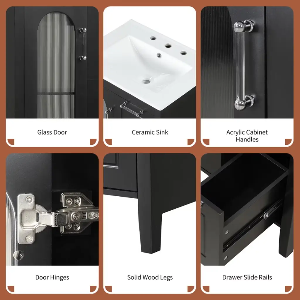 This Gulches bathroom vanity is an excellent addition to any modern bathroom It features a sleek black cabinet with a freestanding design and a durable construction made of high quality solid rubberwood and MDF board The vanity includes a beautiful white ceramic sink top with an undermount drop in design and a center sink location The sink top is equipped with an integrated overflow and a three hole faucet mount The vanity cabinet offers ample storage space with two drawers and a cabinet door The cabinet includes one adjustable shelf providing flexibility in organizing bathroom essentials The drawers feature smooth slides for easy access to frequently used items Constructed with durable solid rubberwood and MDF boards this vanity supports up to 150 pounds Its compact size and elegant design make it a great addition to any bathroom The overall product dimensions are 24 inches in length 18 inches in width and 33 inches in height The cabinet base measures 24 inches in length 18 inches in width and 32 inches in height The sink top dimensions are 24 inches in length 18 inches in width and 5 inches in height This vanity is made in Vietnam and is designed to provide years of reliable use