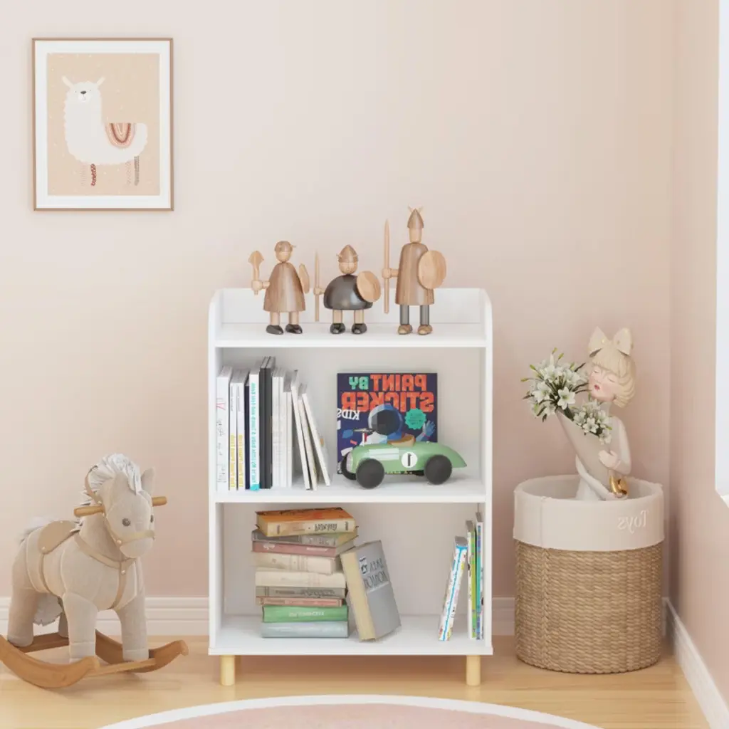 This Gulches kids 3 tier bookcase is a versatile storage solution perfect for any childrens room playroom or nursery It features a height of 31 inches and is crafted from high quality MDF material with sturdy pine legs in a crisp white finish The bookcase includes three spacious shelves providing ample storage for books toys art accessories and more The bookcase is designed with safety in mind featuring a tipover restraint device that can be fixed to the wall ensuring stability and security The dimensions of the bookcase are 22 inches in width 12 inches in depth and 31 inches in height The package includes one bookcase complete with detailed instructions and all necessary accessories for easy assembly