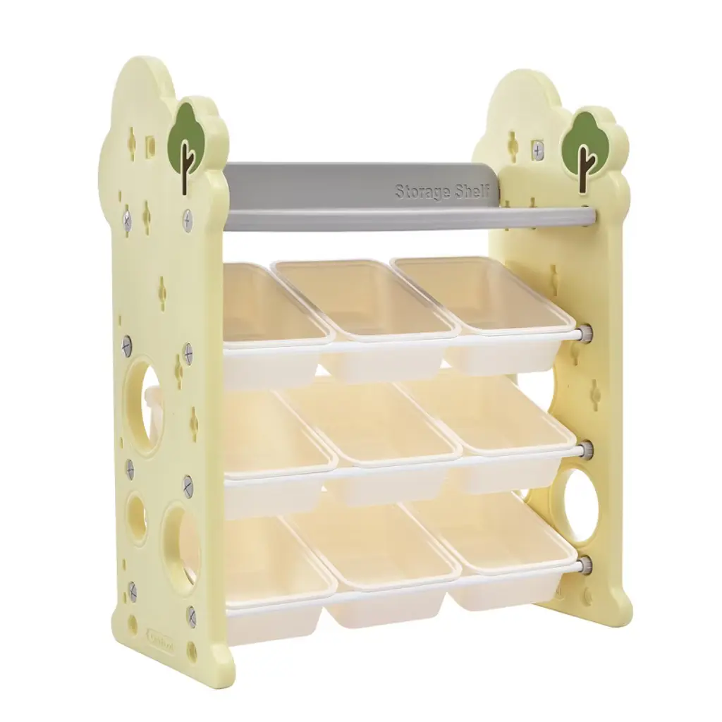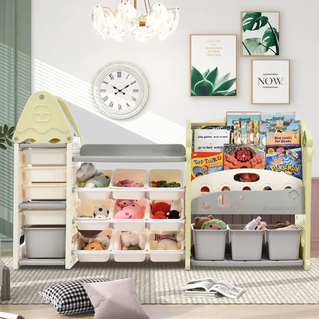 This Gulches kids bookshelf toy storage organizer is a multi functional nursery organizer designed to provide ample storage and organization for your childs room It features a height of 43 inches and is crafted from high quality HDPE material ensuring safety and durability The bookshelf includes 5 spacious shelves and 17 bins 13 medium bins and 4 large removable bins providing considerable storage space for books toys stationeries snacks clothing and other everyday items The top of the bookshelf features a wide storage shelf and a raised hanging rack on the side for additional storage options The overall assembly size is 73 inches in width 17 inches in depth and 43 inches in height The package includes one bookshelf complete with detailed instructions and all necessary accessories for easy assembly