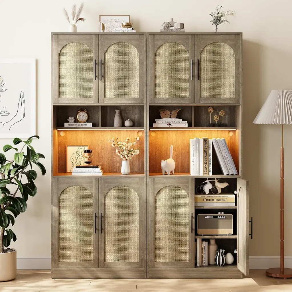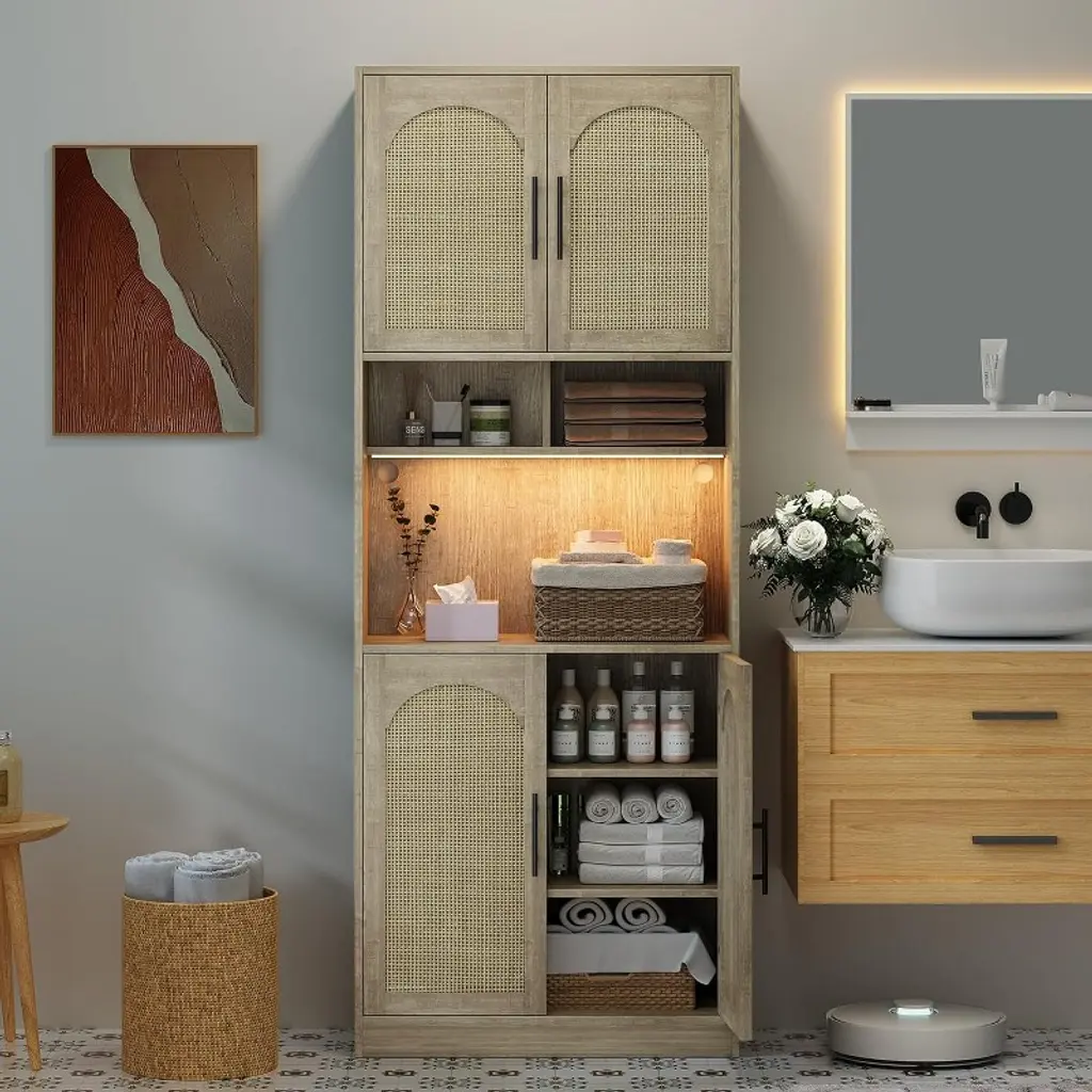 Gustowave 71" Pantry Cabinet, Tall Rattan Bathroom Hutch With Led Lights, Freestanding Kitchen Cabinet With Microwave Shelf, For Dining Room, Beige