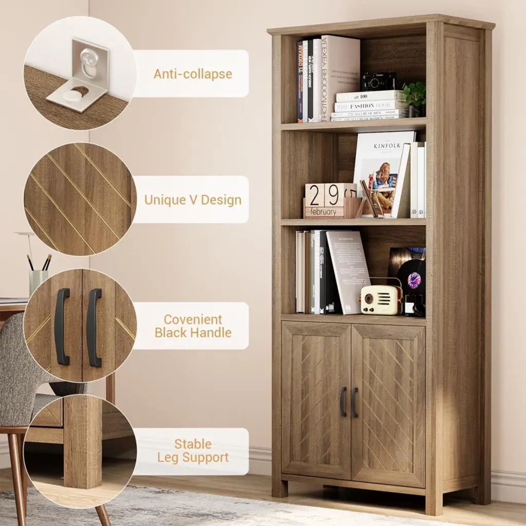 Gustowave Bookshelf 5 Tier Bookcase With Doors And Adjustable Shelves, 70 In Tall Bookshelf With Storage Cabinet, Storage Book Shelf(walnut)