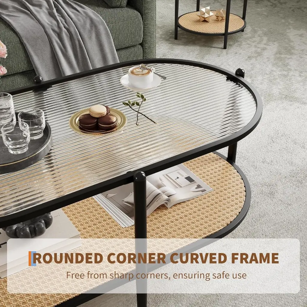 This Boho Farmhouse-Style 2-Tier Glass Coffee Table Combines Durable Metal And Tempered Glass Construction With A Spacious 37" Oval Top And Ample Storage, Offering Easy Assembly And Elegant Functionality For Organized, Stylish Living Spaces.