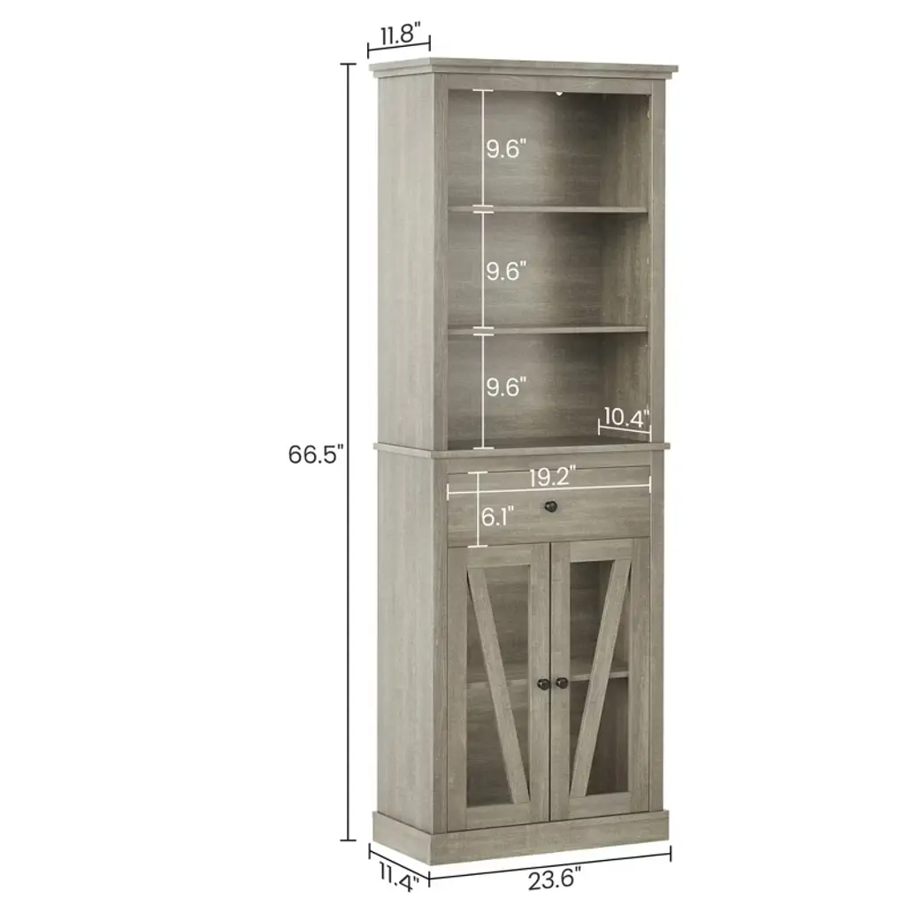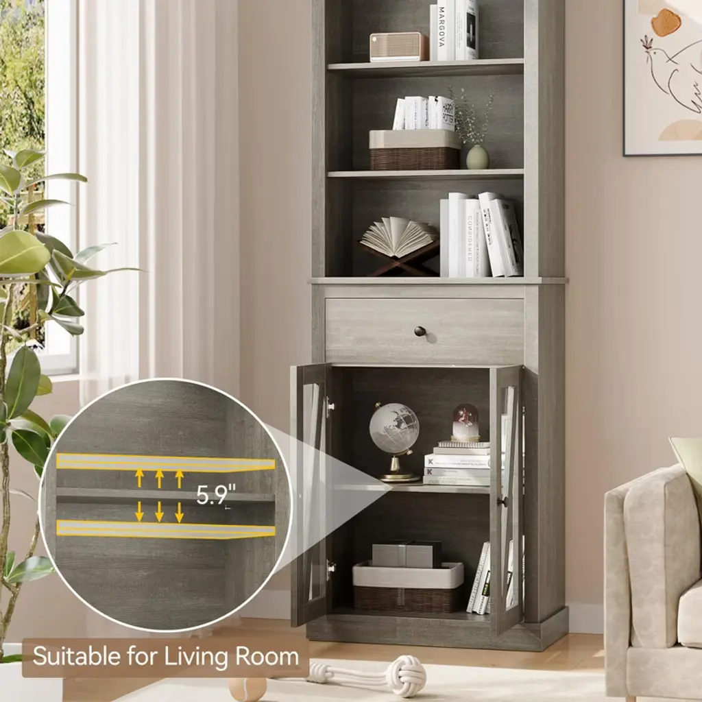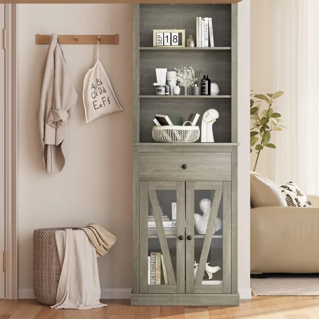 Made from waterproof 15mm MDF, this wooden bookshelf is easy to clean and comes with a reinforced base for stability and includes an anti-tip kit to ensure safety in a busy home. With rustic barn doors and vintage handles, this tall storage cabinet is full of charm, with smooth-gliding drawers and practical shelves for everyday use. It is very suitable for use as a living room display cabinet, bathroom cabinet or home office storage cabinet, which can not only store items neatly, but also enhance your home decoration effect.