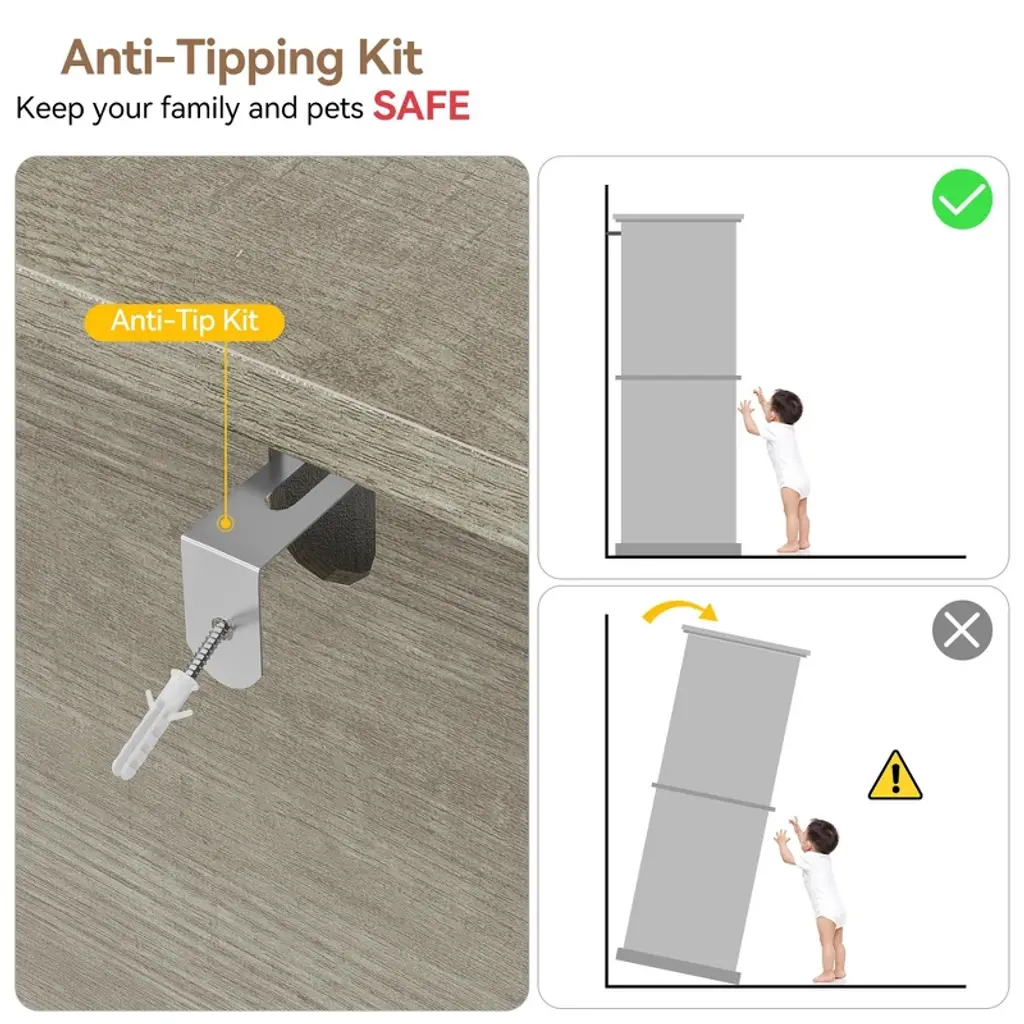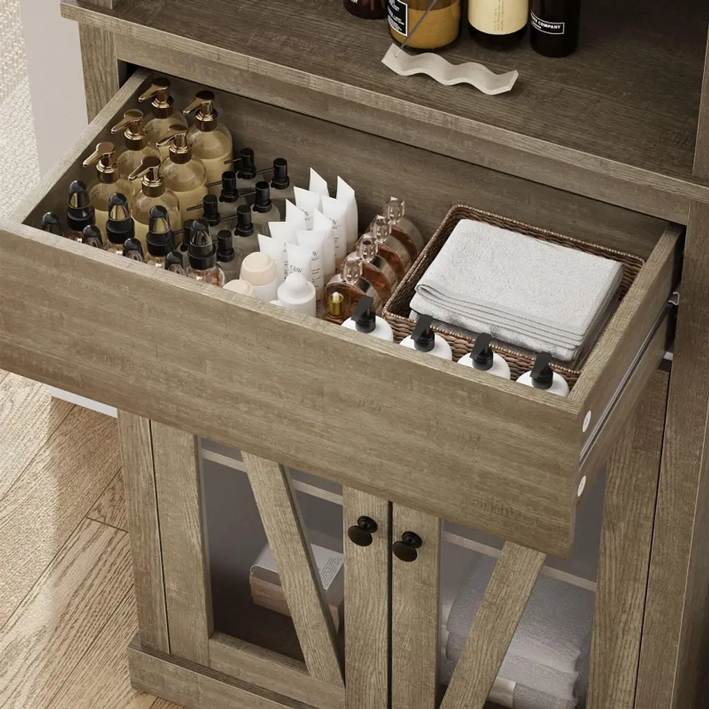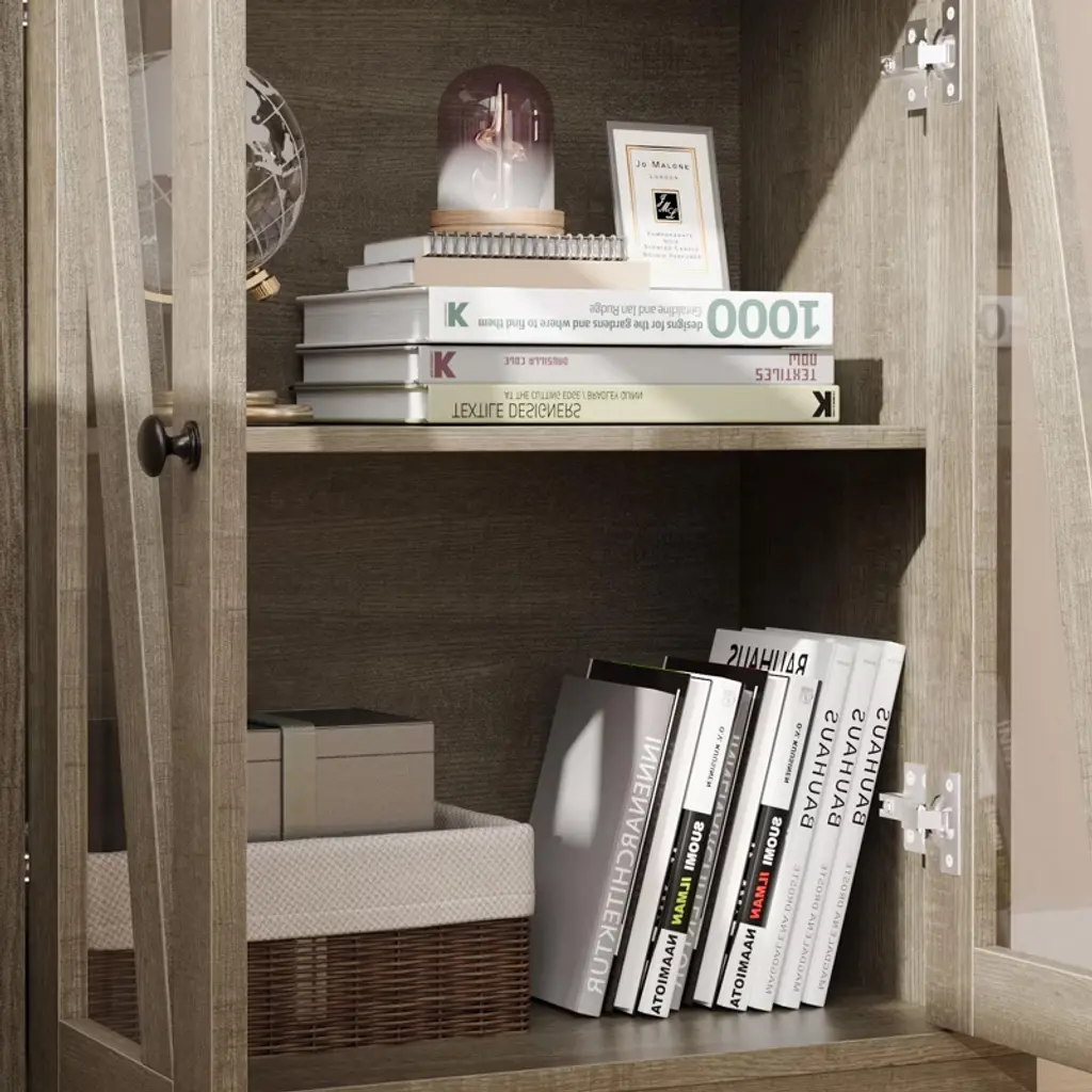 Made from waterproof 15mm MDF, this wooden bookshelf is easy to clean and comes with a reinforced base for stability and includes an anti-tip kit to ensure safety in a busy home. With rustic barn doors and vintage handles, this tall storage cabinet is full of charm, with smooth-gliding drawers and practical shelves for everyday use. It is very suitable for use as a living room display cabinet, bathroom cabinet or home office storage cabinet, which can not only store items neatly, but also enhance your home decoration effect.