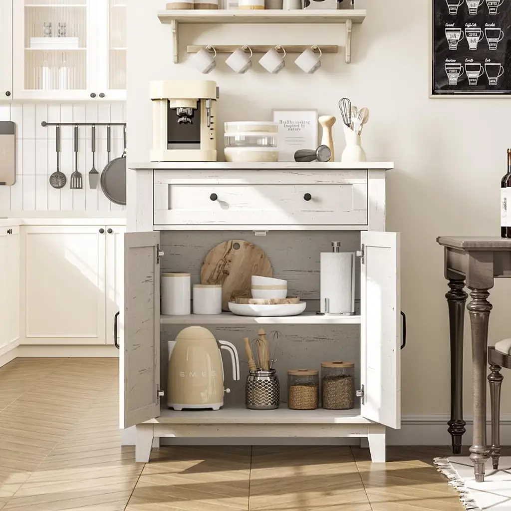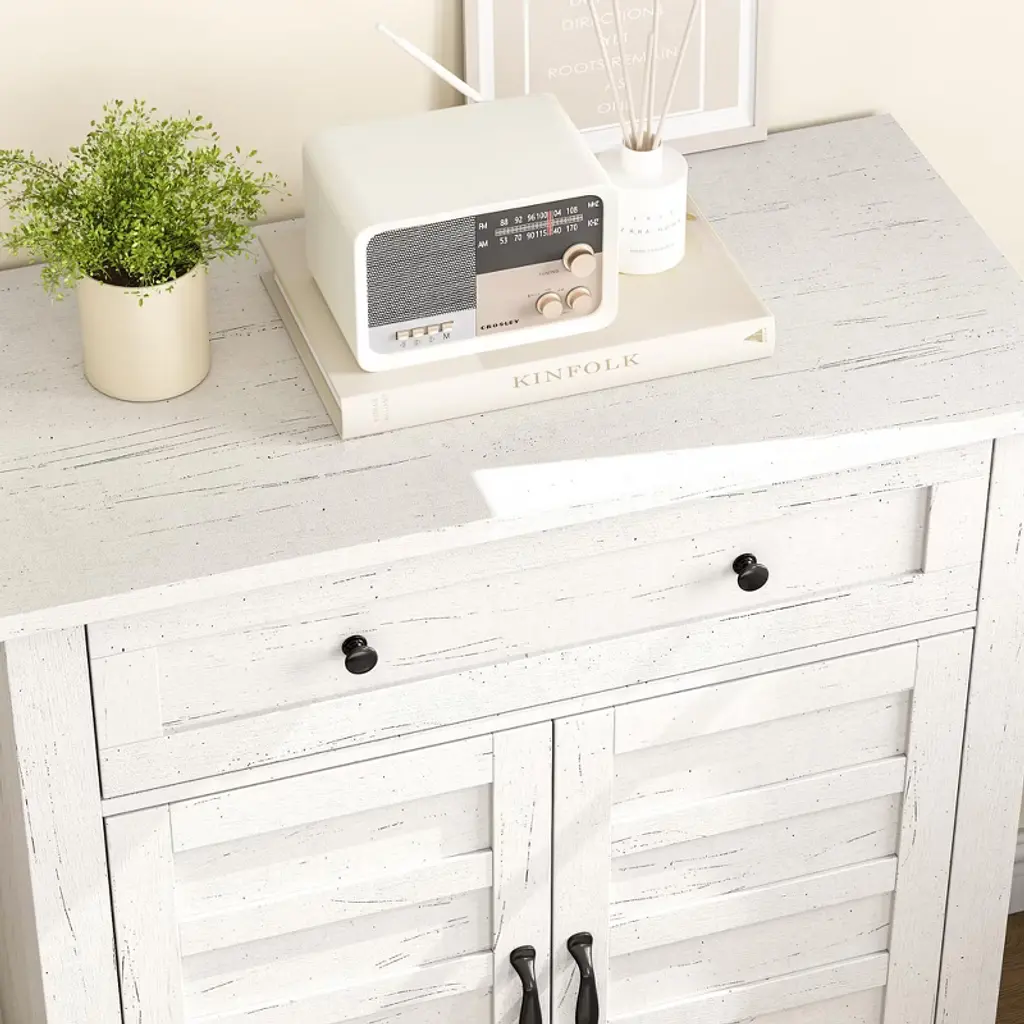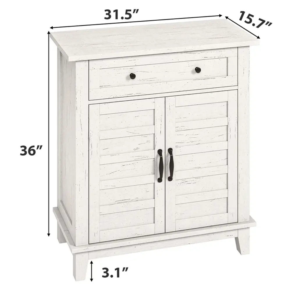 Designed for kitchens, dining areas, entryways, or home offices, this 31.5" cabinet combines rustic charm with practical organization. Features 3 adjustable shelves (3-position customization) and a ventilated slatted door to store cookware, pantry essentials, or decor while enhancing farmhouse-style interiors. Tailor storage to your needs with reinforced shelves (supports up to 100 lbs each) and smooth-gliding drawer rails. The anti-wobble hinges and solid wood-style legs provide stability, while ventilation holes maintain airflow for pantry items or shoes.