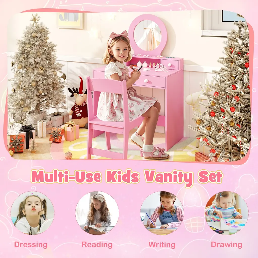 Elevate your child's playtime with this kids dressing table. With child-safe features like a shatterproof acrylic mirror and rounded corners, safety is ensured. The princess vanity set comes with ample storage including shelf and drawers for organization. Stability is a priority with an anti-toppling device. This versatile desk and chair set makes a perfect gift for any occasion, providing a safe and enjoyable space for your child to dress up, read, write, draw, and more.Features:Ample storage space with an open shelf and drawers Enhanced safety with shatterproof acrylic mirror Can be attached to the wall with included anti-toppling device Avoids injuries with anti-collision round cornersColor: White / Pink Material: MDF, Acrylic Mirror Table Dimension: 27.5'' x 15.5'' x 43.5'' (L x W x H) Chair Dimension: 14'' x 12'' x 25.5'' (L x W x H) Seat Dimension: 11'' x 11'' x 12.5'' (L x W x H) Mirror Diameter: 11'' Tabletop Height: 24'' Weight Capacity of Tabletop: 110 lbs Weight Capacity of Chair: 165 lbs Suitable Age: 3, years old Net Weight: 35 lbs Package includes: 1 x Vanity Table 1 x Chair 1 x User Guide