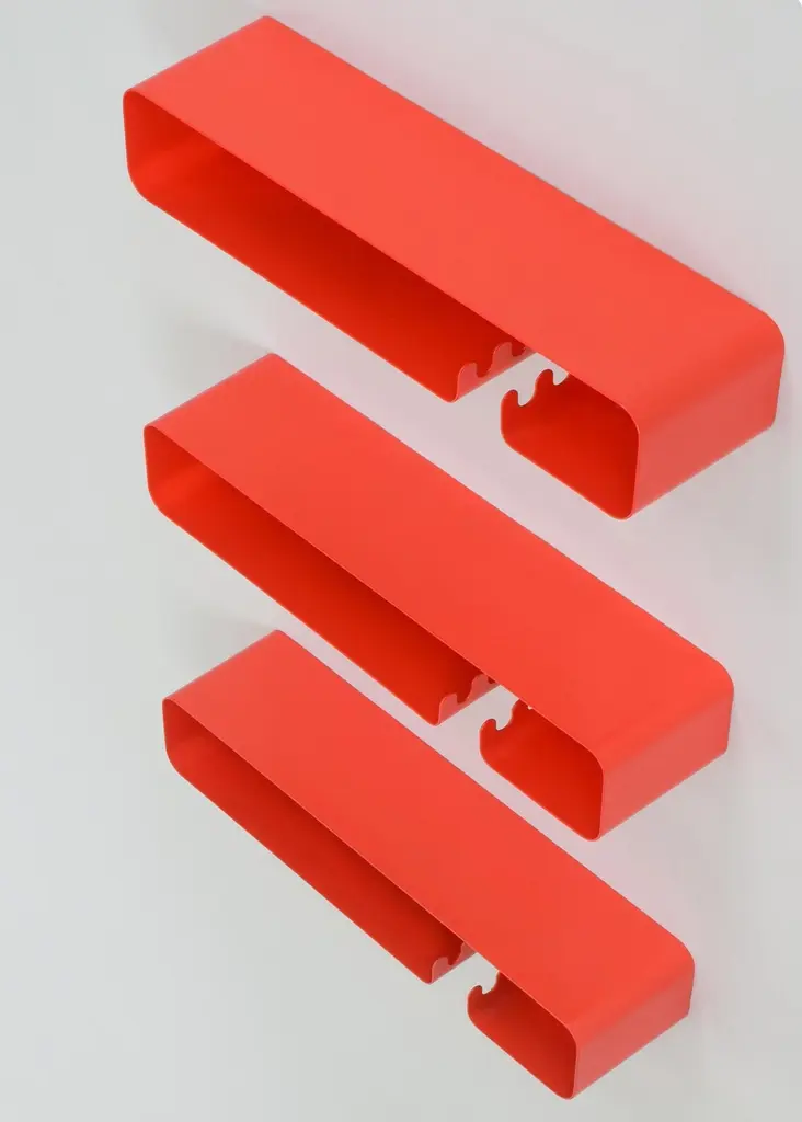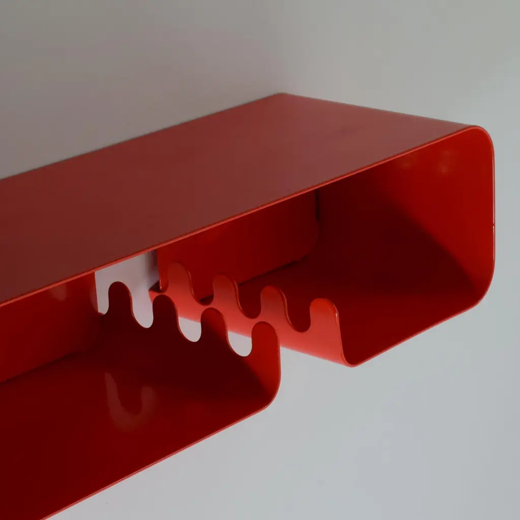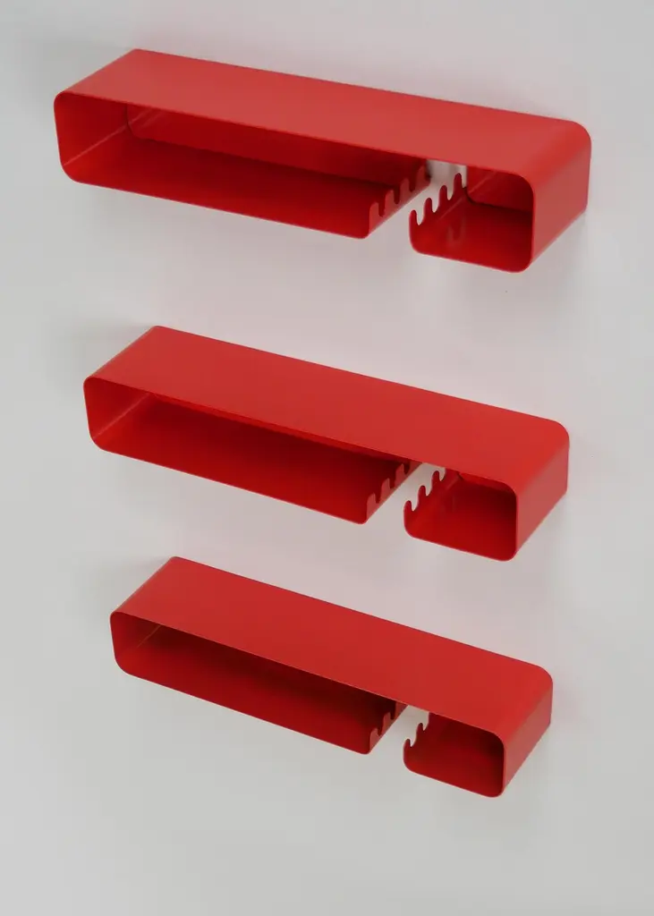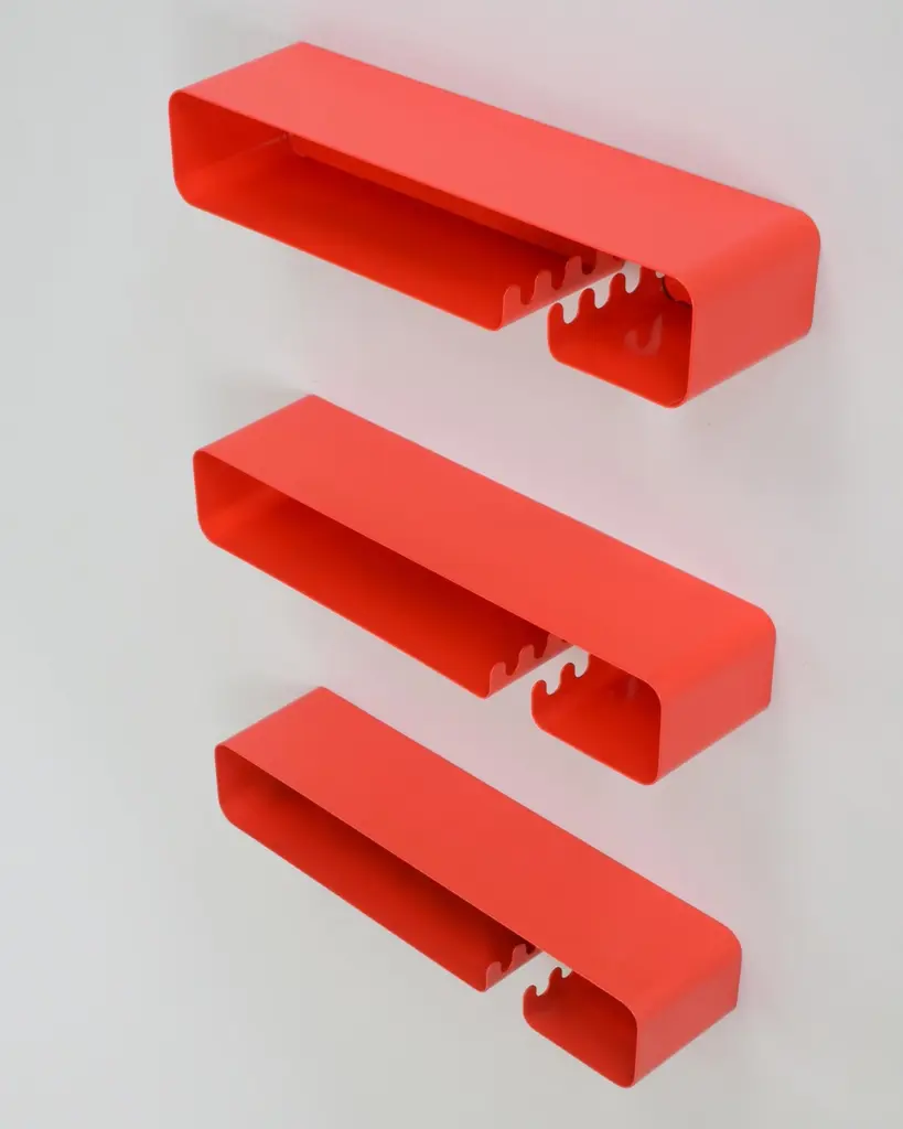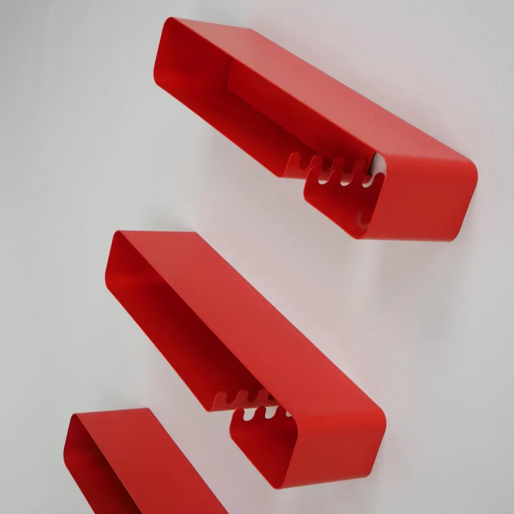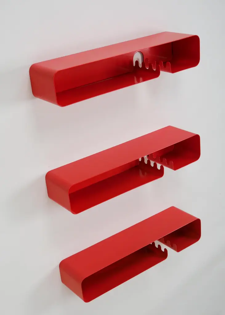 Habitat 'Pop' shelf unit, c. 1980s.Red lacquered metal with integrated finger-like towel or coat hooks.Super little wall-mounted shelf units, ideal for entrance areas, kitchens, bathrooms and cloakrooms. These units are individually wall-hung. We have three available, selling individually or as a set. Two are perfect unused condition, one is good used condition showing some signs of use.We have one set of original wall fittings, and two sets of copies of fittings (these are not visible once shelves are mounted).Habitat, the UK retailer, was founded in 1964 by Sir Terence Conran. These shelf units are quite typical of the fun, pop-art influenced work that Habitat were producing in the 70's and 80's.
