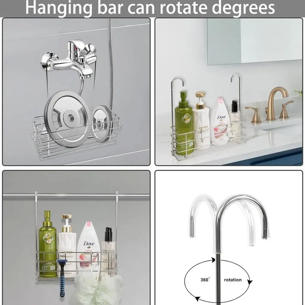 ROTATABLE - 360° swivel hook design, no need to fix the shower hangers to the wall, so no more damaging the wall and falling off. The hanging shower organizer is very convenient and removable.STORAGE IS EASY AND HEALTHY - This hanging shower organizer allows you to store your shower supplies anywhere, anytime with this handy shower door organizer. The open grid design maximizes drainage and air circulation, and items can dry quickly to reduce the risk of mold and mildewLARGE CAPACITY ---- This shower rack is perfect for storing shampoo, conditioner, body wash, hand sanitizer, shaving cream, essential oils, facial cleanser and toiletries. Perfect for apartments, condos, dorms, showers, RVs and campers.DURABLE - Made of high quality 304 stainless steel, it can hold up to 30 pounds, holds tall and heavy bottles safely and is very easy to install.DUAL HOOK DESIGN: Compared to the original rear hook shower rack, we specially added a side hook to keep it level. It won't tilt forward when it needs to be hung on shower rod/curtain rod/crossbar/towel bar/grab bar.