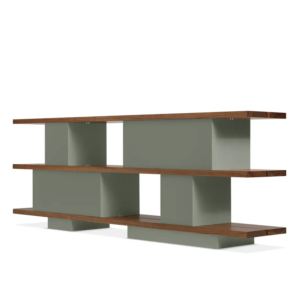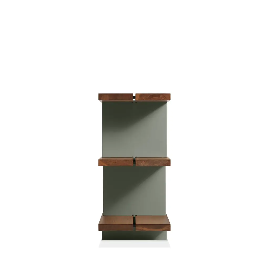 Wood shelves and metal blocks stack without the need for hardware forming beautiful voids and cubbies to house all things in a perfectly curated manner. Two widths of foot and shelf blocks celebrate asymmetry while bringing stability and visual appeal.