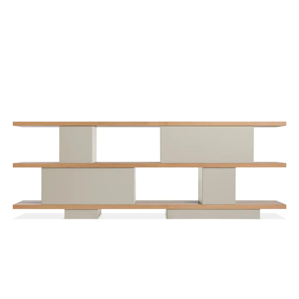 Wood shelves and metal blocks stack without the need for hardware forming beautiful voids and cubbies to house all things in a perfectly curated manner. Two widths of foot and shelf blocks celebrate asymmetry while bringing stability and visual appeal.