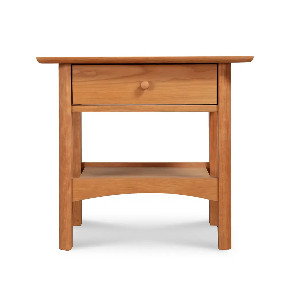 Delivery Information: This furniture piece is available for pick-up from our Southern Vermont showroom or delivery throughout New England, New Jersey, New York City and select areas of eastern New York State. Our high-quality Heartwood Shaker Nightstand or Bedside Table is handcrafted by Vermont craftsmen from solid wood. This bedroom night stand features one drawer and one open shelf underneath. Heirloom quality fine furniture for the modern bedroom. All our Modern Shaker bedroom furniture is made from natural cherry and naturally finished with eco-friendly oil finish. One (1) available in natural cherry, 22" high with a rounded edge profile Finish: Oil and wax Please note: Clearance items are excluded from our lifetime guarantee and are not eligible for refunds, returns, or replacements. Showroom and Clearance items are subject to wear and tear and may show signs of use as a display model. Additional details, images and viewing options are available upon request.