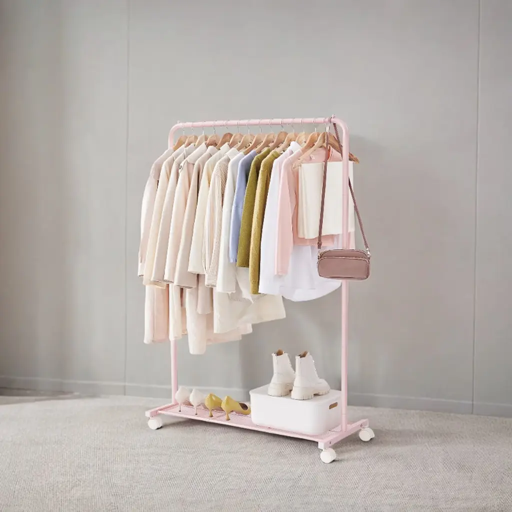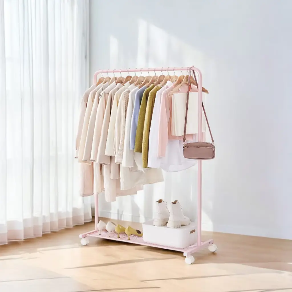 Heavy-duty Clothes Rack With Dense Mesh Storage Shelf, 25.4mm Metal Garment Rack With Wheels And 2 Brakes Freestanding Clothes Rack Pink