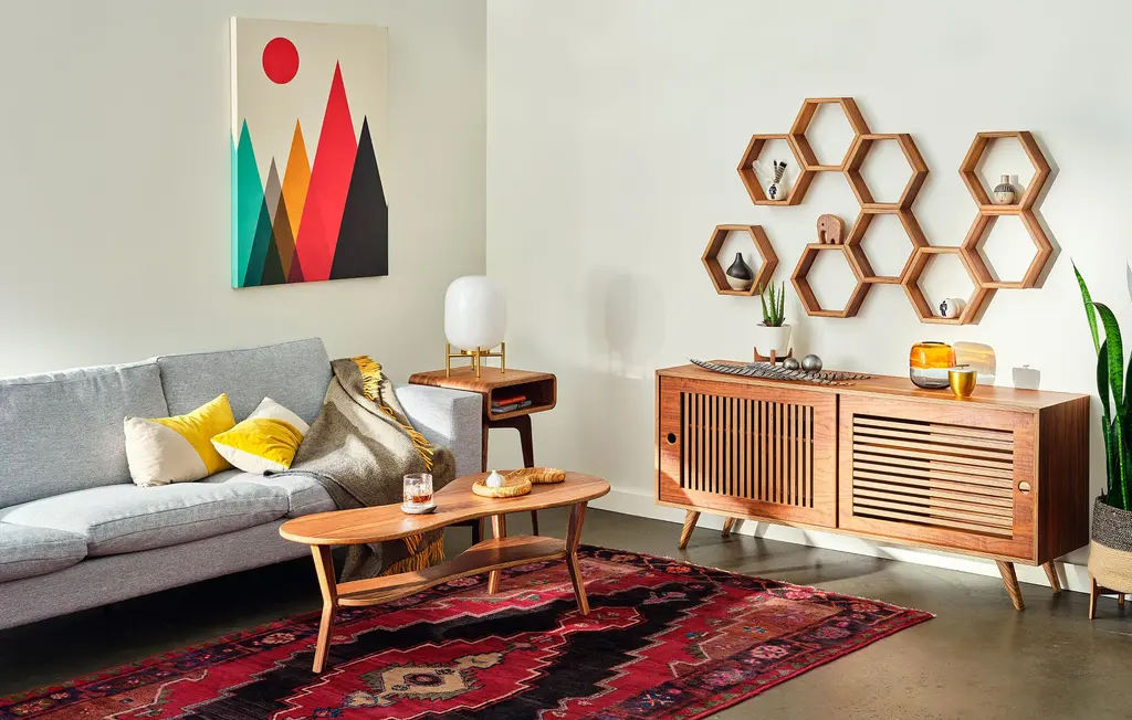 These geometric hexagon wall shelves are calming to look at, exciting to decorate, and will be a smash hit in your home. Perfect for any room - living room, dining room, bedroom, or den, they’re made of Baltic birch with a walnut face. Though there are 8 shelves, the open space between them makes it feel like so many more! This item is sold in this pre-arranged pattern, and requires minimal assembly upon delivery (4 hex bolts, with tools and instructions included). Hanging hardware is included with the package. Handcrafted in Minneapolis. MATERIALS (01) Veneered Baltic Birch Our furniture and decor pieces are made using a beautiful high-end Baltic birch from Columbia Forest Products®. Each of the 13 layers of the ply are solid wood, and a thick face in walnut wraps each face in rich tones. The Baltic birch is a sustainable product and will be very stable as the seasons change, unlike some solid wood products. While many woodworkers conceal the edges of the plywood, we have made it our signature look to highlight the striped layers. Not only does this give a nod to the designers of the mid-century era, it makes every piece by Hossle Woodworks a work of art, and a unique, one-of-a-kind, creation. (02) Finish We finish our products with a mixture of pure tung oil, boiled linseed oil and wax. This means less harsh chemicals when we are doing the work, and a safer breathing experience for you. The end result is a durable, water-resistant matte finish that feels like a silky-smooth piece of wood. Another benefit to the finish is that it allows for easy repair when scratches happen. Buff out the scratch with a piece of high-grit sandpaper and rub in some Howard Feed-N-Wax® and your piece is as good as new!