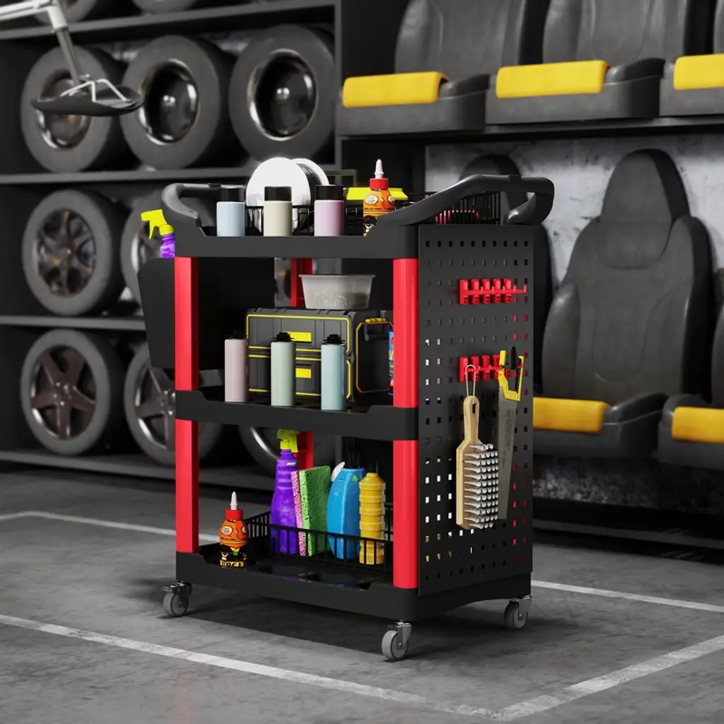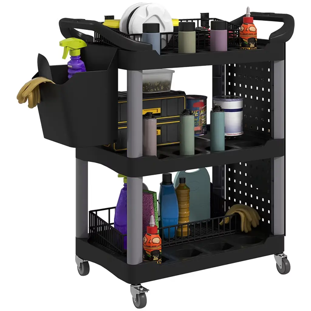 Unleash the power of organization with the HOMCOM utility cart! This versatile tool cart is designed to keep your garage or workshop neat and tidy. It features three-tier shelves, a side-hole shelf with ten hooks for hanging tools, and a handy storage bucket. With side handles and wheels with brakes, this rolling cart can be positioned wherever you need it to optimize your workspace.