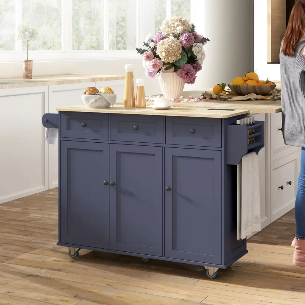 Homcom Rolling Kitchen Island With Charging Station And Drop Leaf, 53" Kitchen Island Table With Wood Top, 3 Drawers, Adjustable Shelf, Dark Blue