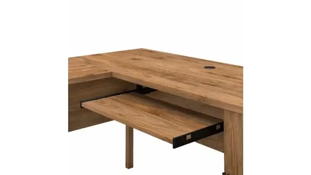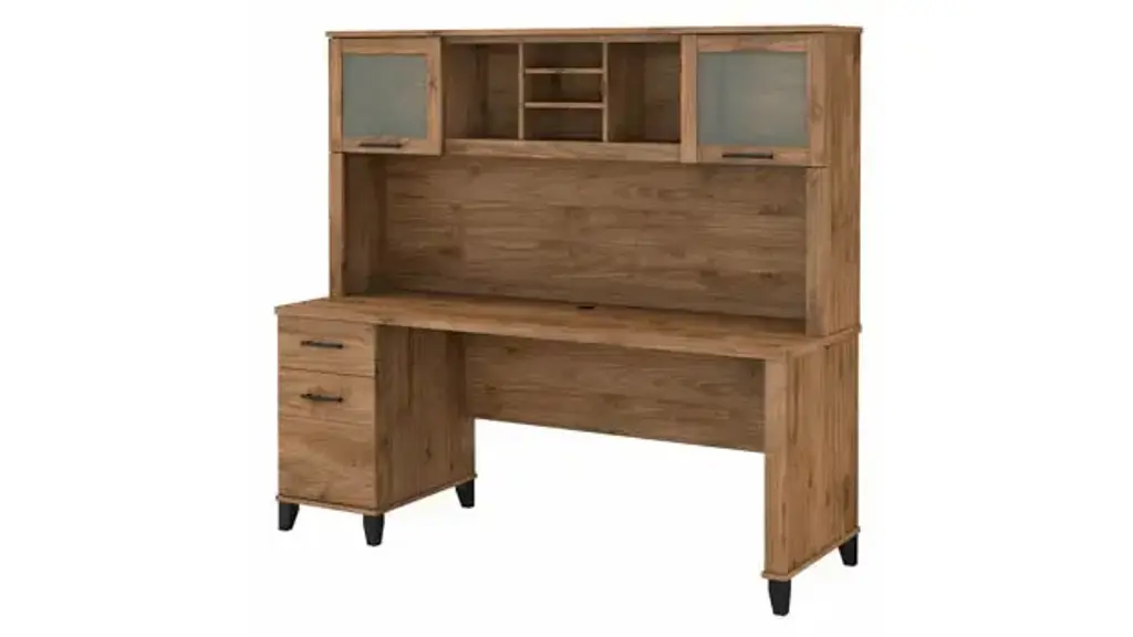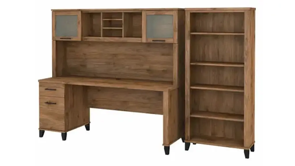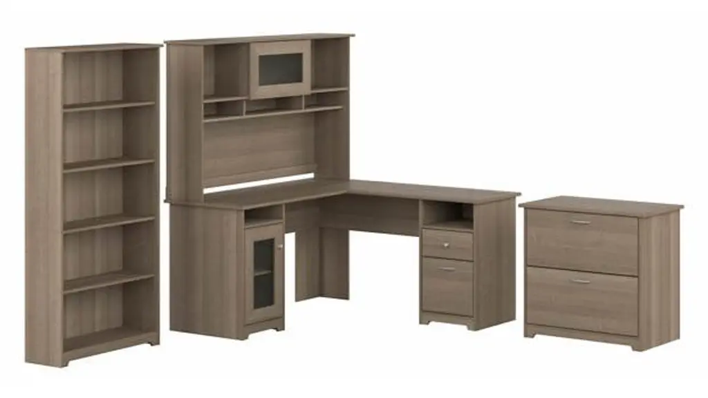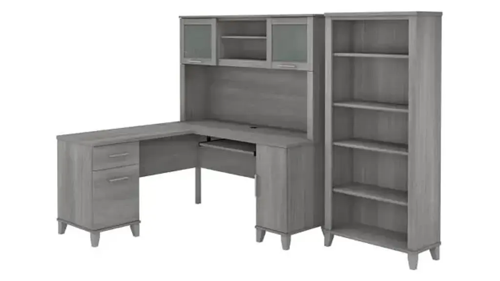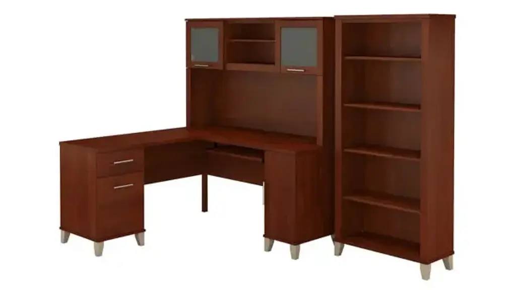 This Desk is Reversible With practical features and a stylish design, the Bush Furniture Somerset 60"W L-Shaped Desk with Hutch and 5 Shelf Bookcase delivers a personal workspace perfect for the home or small office. The expansive 60"W surface with wire management offers ample room to spread out and complete large projects. A convenient pull-out shelf provides a perfect place to keep a keyboard or laptop, while a vertical storage cabinet with an adjustable shelf and a box drawer offer plenty of storage for office supplies and utensils. A file drawer opens on smooth ball bearing slides for an easy reach to letter size documents, even those all the way in the back. The Hutch mounts to either side of the L-Shaped Desk and has a large open compartment for books, binders or decorations and two lift-up frosted glass doors for concealed storage. The 5 Shelf Bookcase matches the height of the Desk and Hutch set to create a coordinated look in your office. Two of the Bookcase's shelves are fixed for stability and three are adjustable to ensure that items of all sizes have their place. Transitional styling includes your choice of stylish finishes with tapered leg accents and contemporary metal hardware for an alluring appearance. This quality furniture is tested to meet ANSI/SOHO standards for safety and performance. American made with U.S. and imported parts. Overall Dimensions: 59.16"W x 59.16"D x 65.21"H. Ships ready for easy assembly.