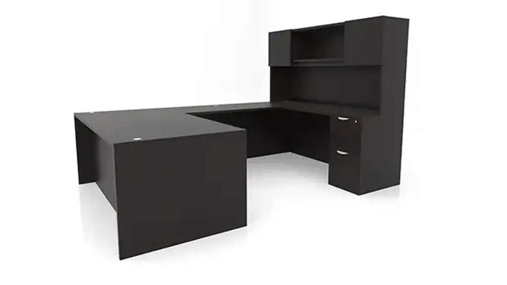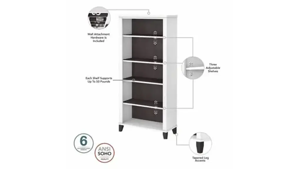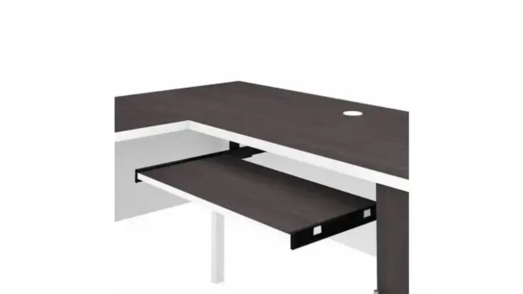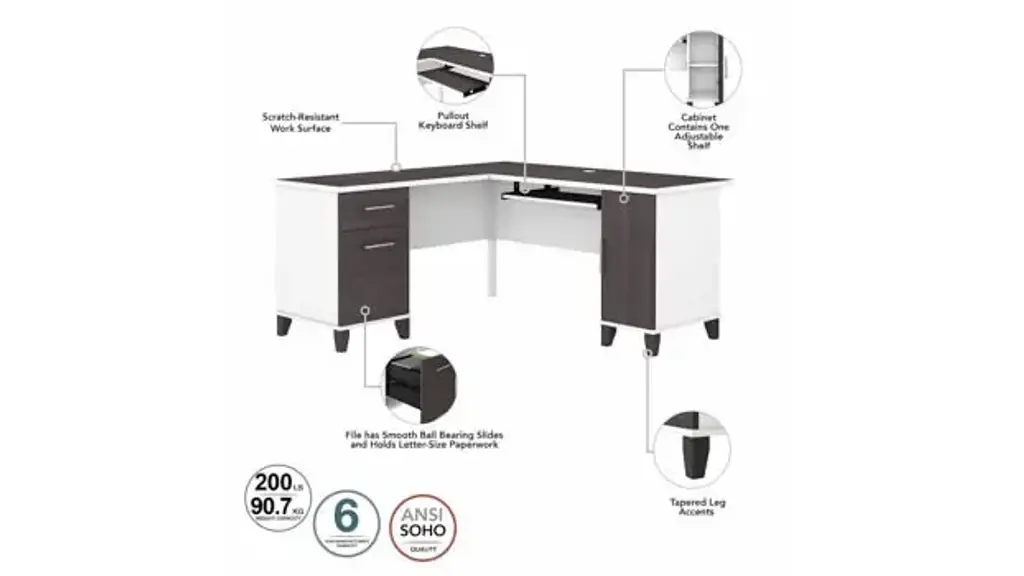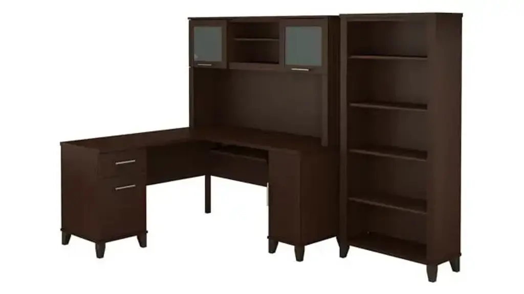This Desk is Reversible With practical features and a stylish design, the Bush Furniture Somerset 60"W L-Shaped Desk with Hutch and 5 Shelf Bookcase delivers a personal workspace perfect for the home or small office. The expansive 60"W surface with wire management offers ample room to spread out and complete large projects. A convenient pull-out shelf provides a perfect place to keep a keyboard or laptop, while a vertical storage cabinet with an adjustable shelf and a box drawer offer plenty of storage for office supplies and utensils. A file drawer opens on smooth ball bearing slides for an easy reach to letter size documents, even those all the way in the back. The Hutch mounts to either side of the L-Shaped Desk and has a large open compartment for books, binders or decorations and two lift-up frosted glass doors for concealed storage. The 5 Shelf Bookcase matches the height of the Desk and Hutch set to create a coordinated look in your office. Two of the Bookcase's shelves are fixed for stability and three are adjustable to ensure that items of all sizes have their place. Transitional styling includes your choice of stylish finishes with tapered leg accents and contemporary metal hardware for an alluring appearance. This quality furniture is tested to meet ANSI/SOHO standards for safety and performance. American made with U.S. and imported parts. Overall Dimensions: 59.16"W x 59.16"D x 65.21"H. Ships ready for easy assembly.