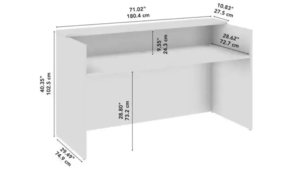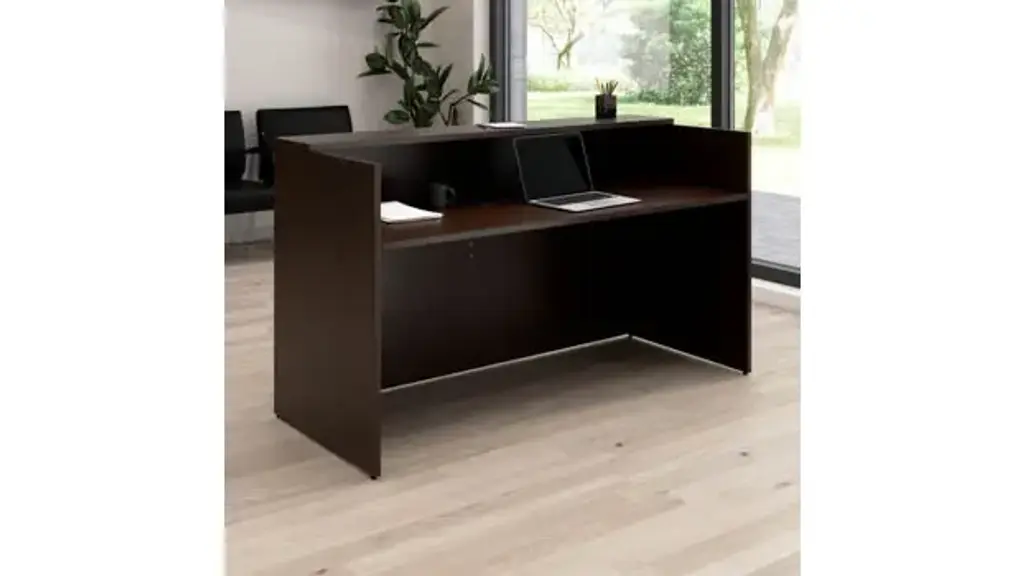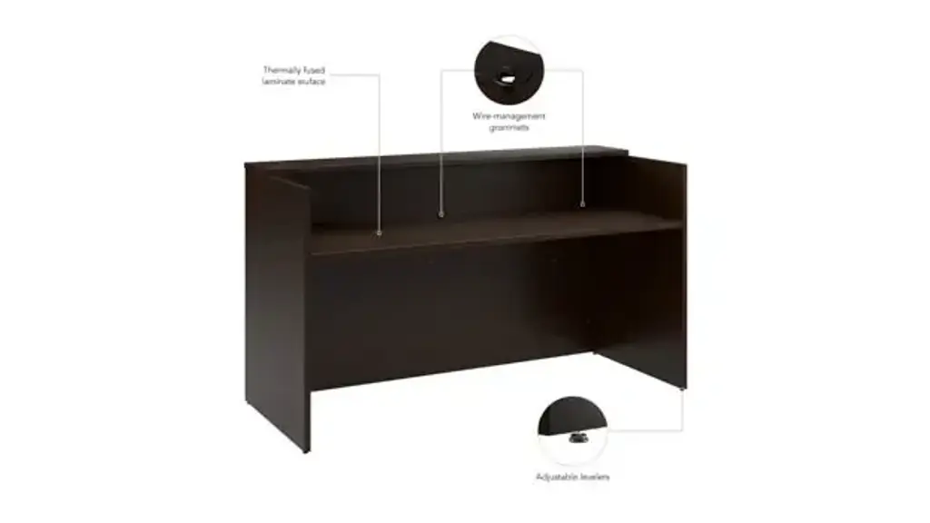 The Bush Business Furniture Arrive 72" W x 30" D Reception Desk with Shelf provides a stylish and practical solution for welcoming guests to your office's waiting room. Greet clients, patients, and other visitors at a front desk that includes a raised shelf for signing in and completing paperwork. The durable thermally fused laminate surface protects against scratches, stains, and other cosmetic damage to preserve the modern reception desk's appearance throughout years of regular use. The desktop easily supports multiple monitors and other equipment with a 200 lb weight capacity and built-in wire management grommets. Multiple finish options offer a look to suit any professional office, hospital, school, salon, or another high-use reception area. The Arrive Collection also includes Waiting Room Tables and Guest Chairs (coordinating items sold separately) for a cohesive lobby furniture set. This commercial-grade receptionist desk has been meticulously tested to meet or exceed ANSI/BIFMA quality standards for safety, durability, and performance. American made with U.S. and imported parts. Overall Dimensions: 71.02" W x 29.49" D x 40.35" H. Ships ready for easy assembly.