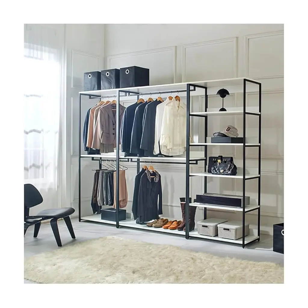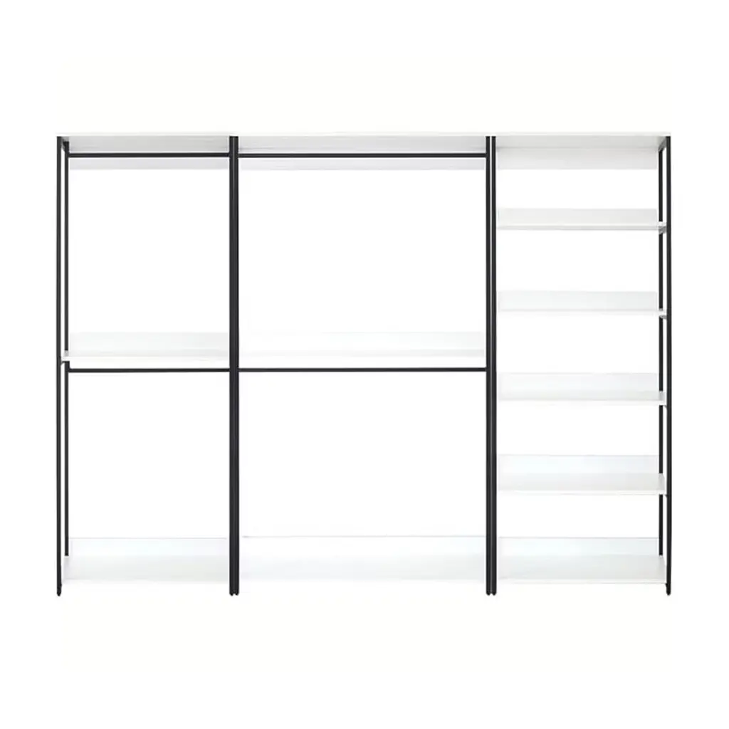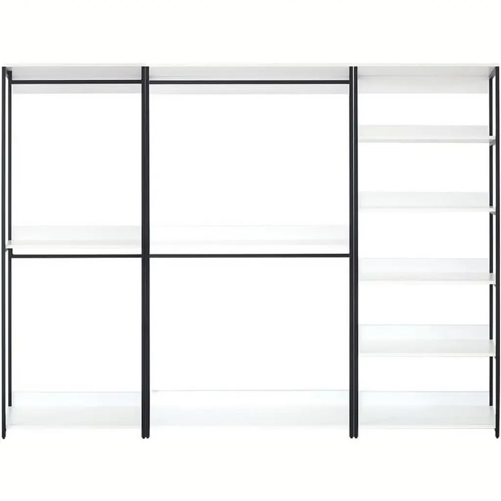 Organize your space with the HomeStock Fiona freestanding walk in closet system, designed for customizable storage solutions. This system includes four tower units, offering ample space for all your belongings. Constructed with durable materials and a premium white finish paired with a powder coated black metal frame, the Fiona Collection provides both style and longevity. The modular design allows for personalized configurations, ensuring efficient use of space for clothing, accessories, and more. Soft closing drawers add convenience and safety, while the classic white wood appearance and black metal frame create a sophisticated look.