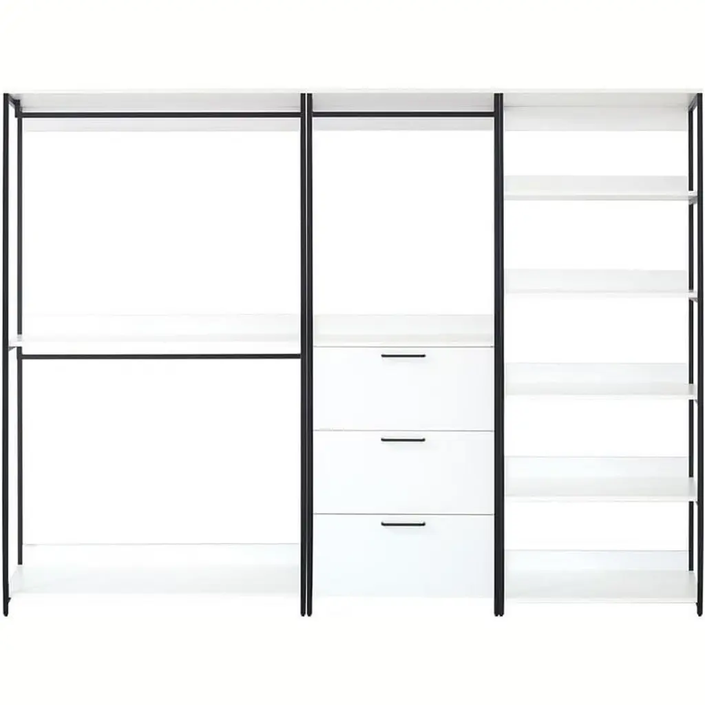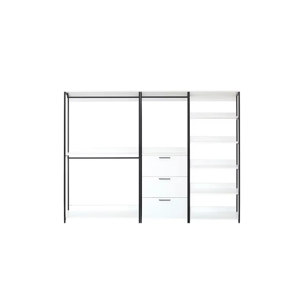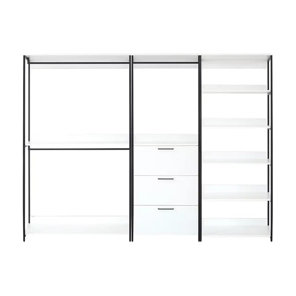 Organize your belongings with the HomeStock Fiona freestanding walk in closet system. This versatile organizer features four tower units, providing ample storage space to suit your needs. Constructed with durable materials and a stylish white finish paired with a powder coated black metal frame, this closet system offers both aesthetic appeal and long lasting durability. The modular design allows for custom configuration, maximizing space and ensuring efficient storage for all your items. Enjoy the convenience of soft closing drawers and a classic design that will elevate your closet organization.
