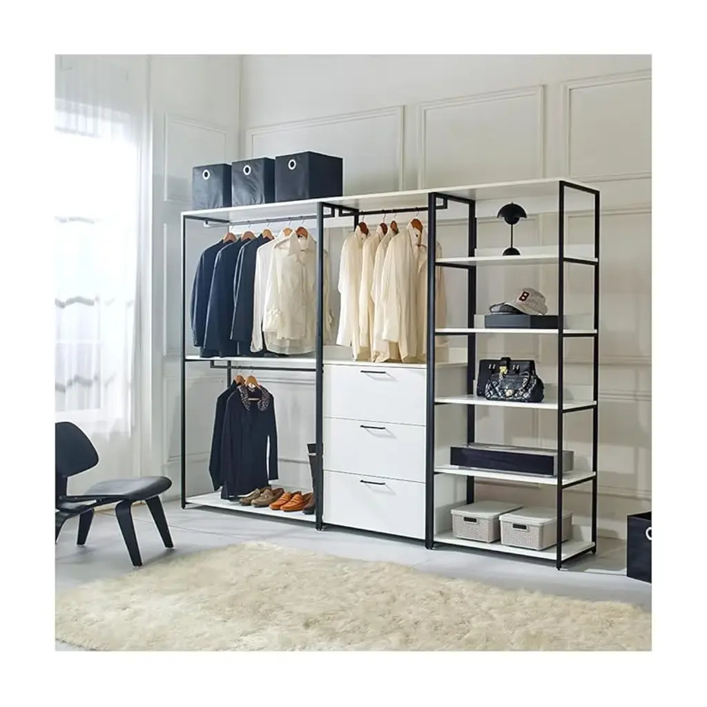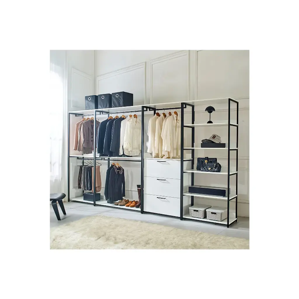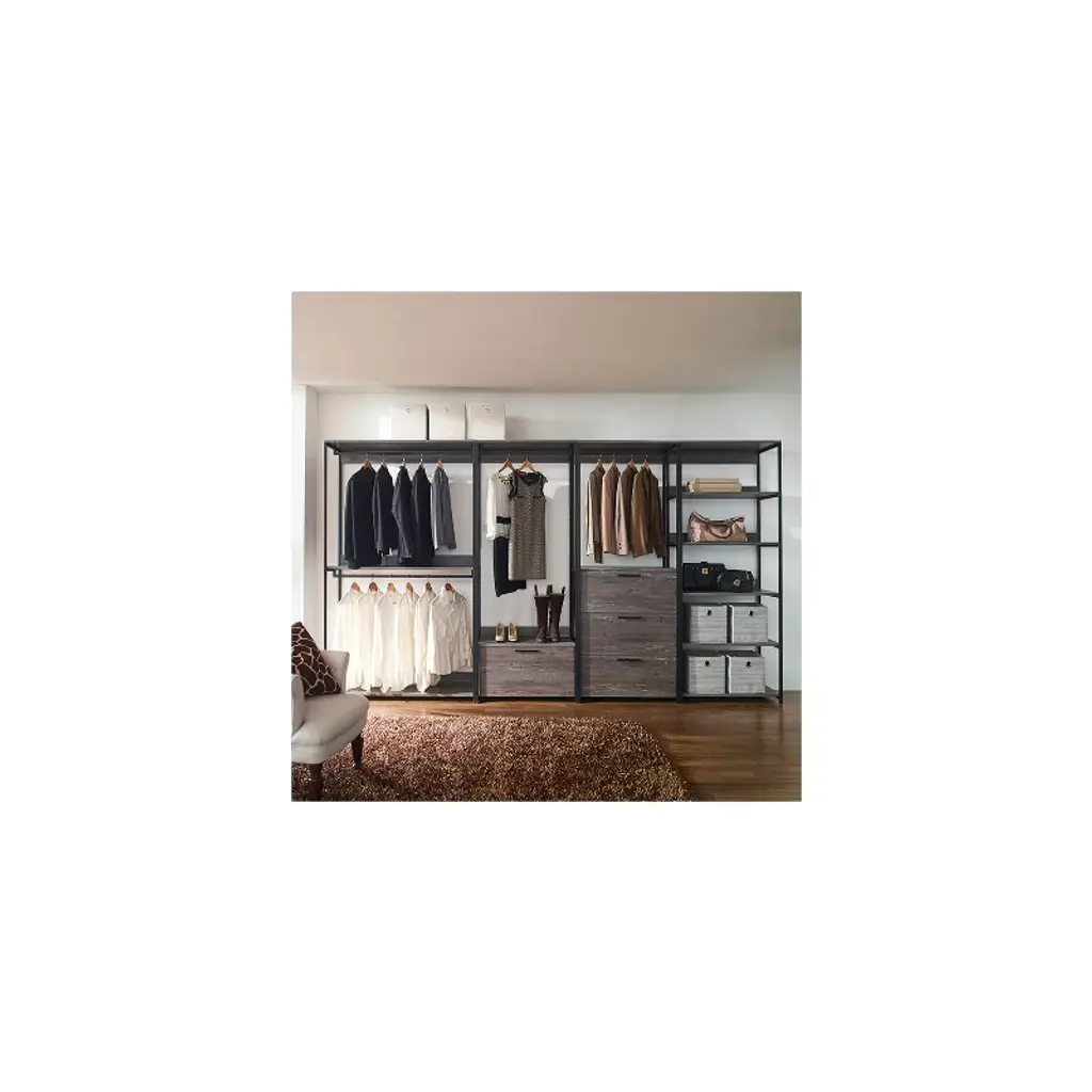 Organize your belongings with the HomeStock Fiona freestanding walk in closet system. This versatile organizer features four tower units, providing ample storage space to suit your needs. Constructed with durable materials and a stylish white finish paired with a powder coated black metal frame, this closet system offers both aesthetic appeal and long lasting durability. The modular design allows for custom configuration, maximizing space and ensuring efficient storage for all your items. Enjoy the convenience of soft closing drawers and a classic design that will elevate your closet organization.