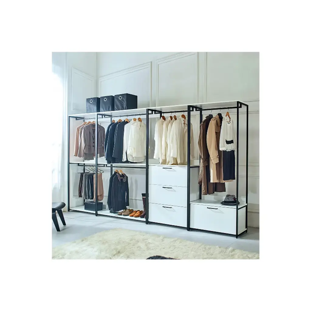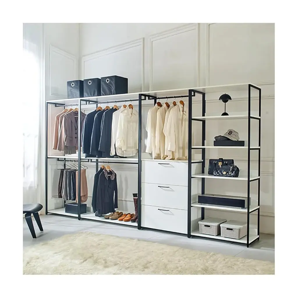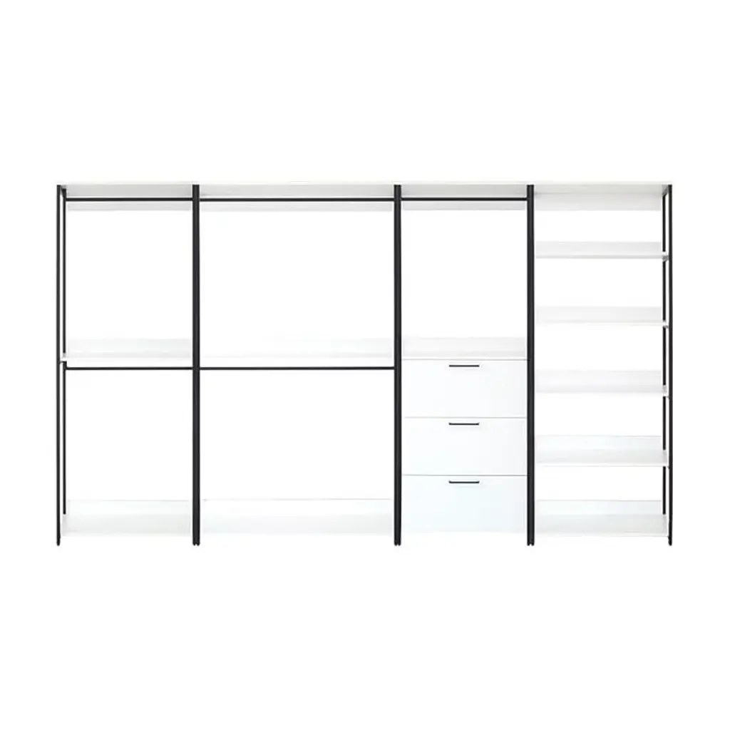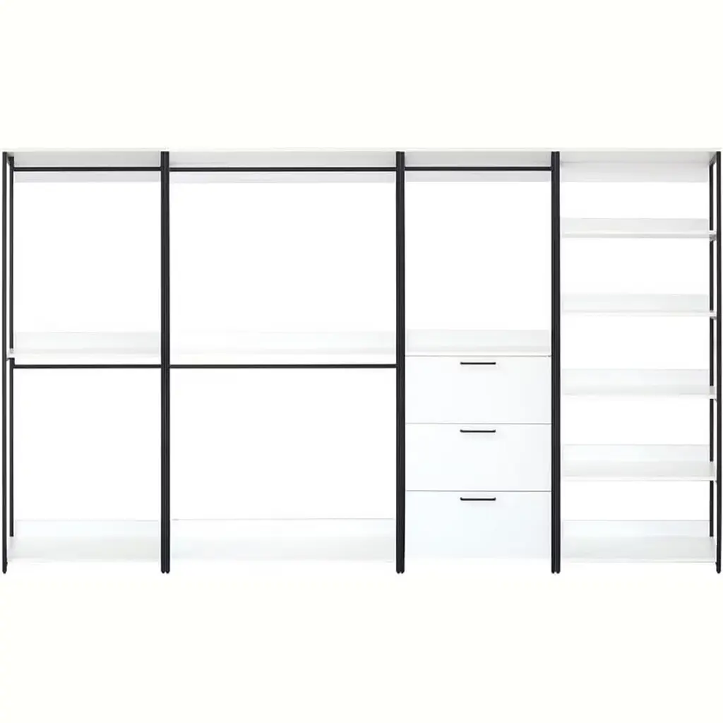 Organize your space with the HomeStock Fiona freestanding walk in closet system, featuring four tower units and ample storage. Constructed with durable materials and a stylish white finish, this closet organizer offers a unique two tone look with its powder coated black metal frame. The modular design allows for custom configuration to suit your needs, providing generous space for all your belongings. Soft closing drawers add convenience and safety, while the classic white wood appearance and black metal frame create a stylish and functional storage solution.