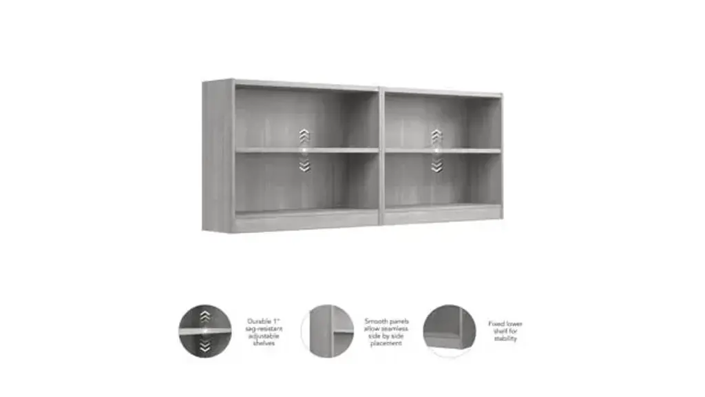 The Bush Furniture Universal Small 2 Shelf Bookcase Set of 2 provides a versatile organization solution that makes it easy to show off your personal library or brighten up the room with pictures and decorations. Perfect for residential and professional use, this durable horizontal bookshelf is designed to excel anywhere flexible storage and display capacity is needed. A one-inch thick adjustable shelf moves up and down to accommodate larger items like reference materials, binders and photo albums while one fixed shelf gives the low bookcase added stability. Shelves have a weight capacity of 50 pounds each, so storing paperback and hardcover books, vinyl records, DVDs or video games is never a problem. Wall attachment hardware is included for family-friendly safety and security in a home office or living room. A variety of finish options allow you to find the perfect look to match with your current decor. This small bookshelf has been meticulously tested to meet or exceed ANSI/BIFMA quality standards for safety and performance. Each Bookcase Dimensions: 37.01" W x 11.61" D x 29.72" H. Ships ready for easy assembly.