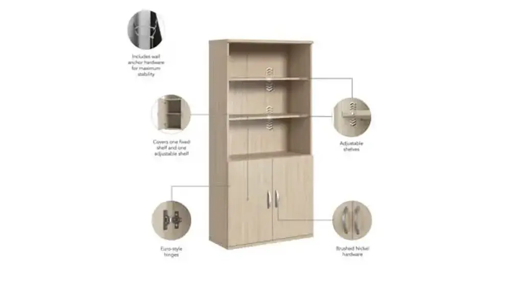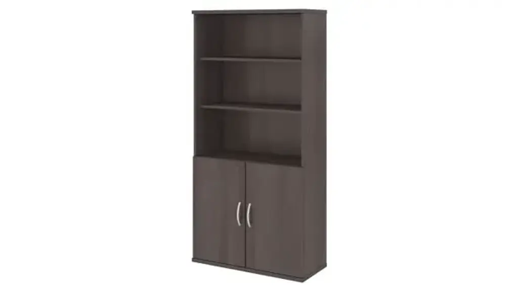 The Bush Business Furniture Studio C 5 Shelf Bookcase with Doors looks great, works hard and adjusts to fit the needs of your office. Designed with 2 fixed and 3 adjustable shelves, the Bookcase holds your books and reference materials with room for your favorite decorative accents. Store a variety of items on the spacious and durable shelves, designed to hold up to 50 lbs. each. A thermally fused laminate finish fends off scratches, stains and dents throughout years of everyday use. The doors conceal your office supplies and add an eye-catching touch to your workspace. With attractive Brushed Nickel hardware, doors cover the lower shelves and self-closing Euro-style hinges make for an easy open and shut. The 5 Shelf Bookcase features a classic design but comes in a contemporary finish to fit perfectly in modern workspaces. Purchase a set of Bookcases to build a complete storage wall that organizes your office and expresses your style. Meets ANSI/BIFMA quality test standards. See the full collection for coordinating items available to make your office your own with Studio C. American made with U.S. and imported parts. Overall Dimensions: 35.71" W x 15.43" D x 72.80" H. Ships ready for easy assembly.