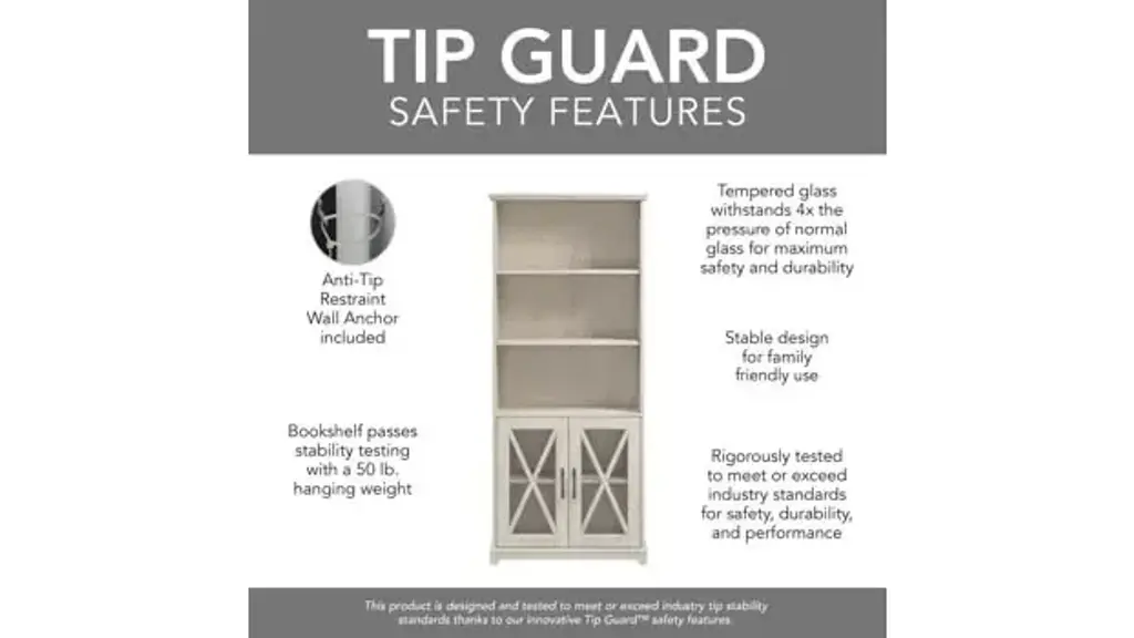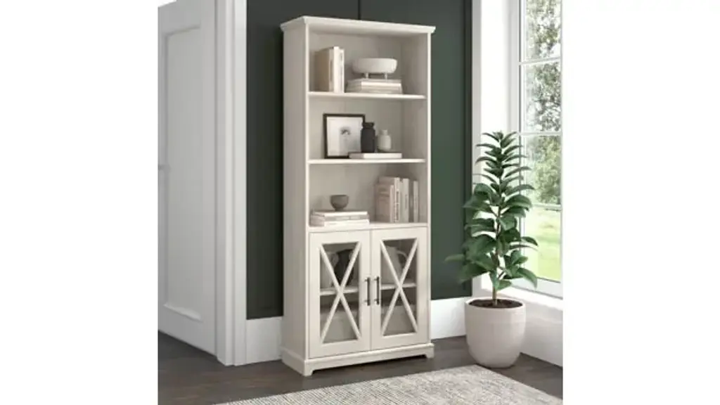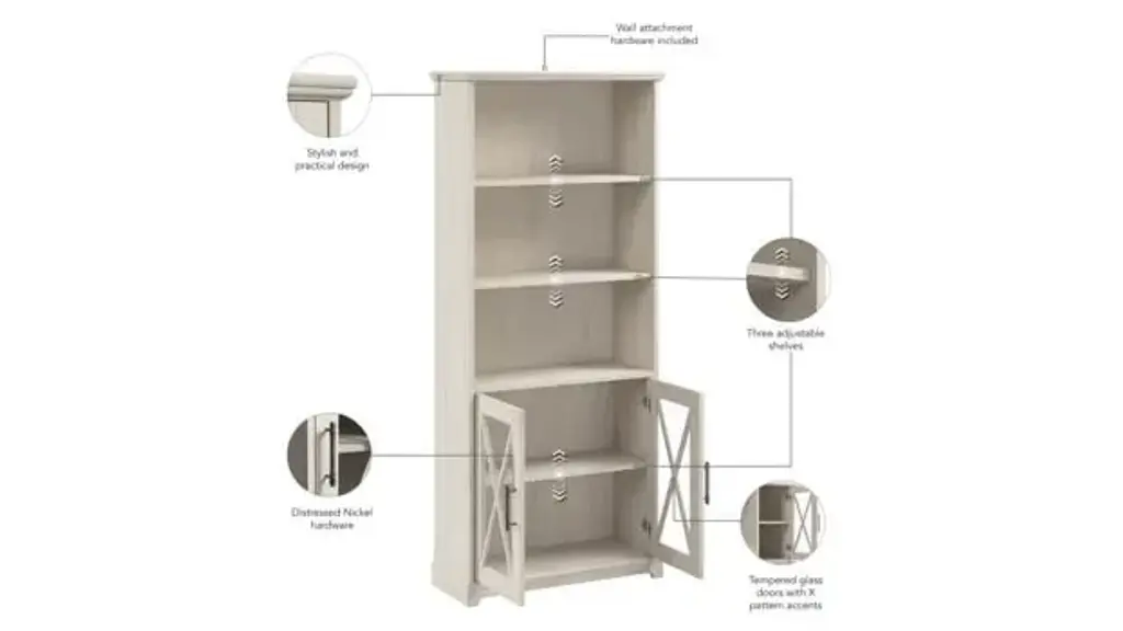 The Bush Furniture Lennox Farmhouse 5 Shelf Bookcase with Glass Doors boasts a practical design to help keep your home in order while conveying a natural, easy-going charm. Two shelves are fixed for stability while three can be adjusted to accommodate books and decorations of various sizes. Each shelf supports up to 50 lbs, so you can organize your personal library and show off larger decor items without worry. Tempered glass cabinet doors with X pattern accents cover the tall bookcase's two lower shelves to conceal the materials you don't want out in the open. The style, versatility, and stable design of this 5 tier bookshelf with doors makes it a great choice for a living room, home office, entryway, or any other residential space. The Lennox Collection's intentionally distressed finish and hardware reflect the best elements of coastal and farmhouse styling to fit perfectly in homes that embrace a more relaxed vibe. This Farmhouse Bookcase has been meticulously tested to meet or exceed industry standards for safety, durability, and performance. Build your ideal living space with coordinating items from the Lennox Collection, including home office desks, file and storage cabinets, living room tables, TV stands, and more. Overall Dimensions: 31.22" W x 12.52" D x 72.01" H Ships ready for easy assembly.