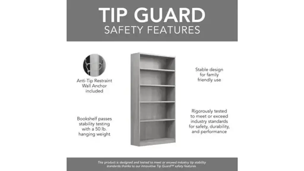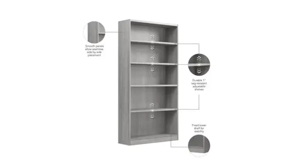 The Bush Furniture Universal Tall 5 Shelf Bookcase provides a versatile organization solution that makes it easy to show off your personal library or brighten up the room with pictures and decorations. Perfect for residential and professional use, this durable 72 inch bookshelf is designed to excel anywhere flexible storage and display capacity is needed. Three adjustable shelves move up and down to accommodate larger items like reference materials, binders and photo albums while two fixed shelves offer added stability. The sturdy one-inch thick shelves have a weight capacity of 50 pounds each, so storing paperback and hardcover books, vinyl records, DVDs or video games is never a problem. Wall attachment hardware is included for family-friendly safety and security in a home office or living room. A variety of finish options allow you to find the perfect look to match with your current decor. This tall 5 tier bookshelf has been meticulously tested to meet or exceed ANSI/BIFMA quality standards for safety and performance. Overall Dimensions: 37.01" W x 11.61" D x 71.46" H. Ships ready for easy assembly.