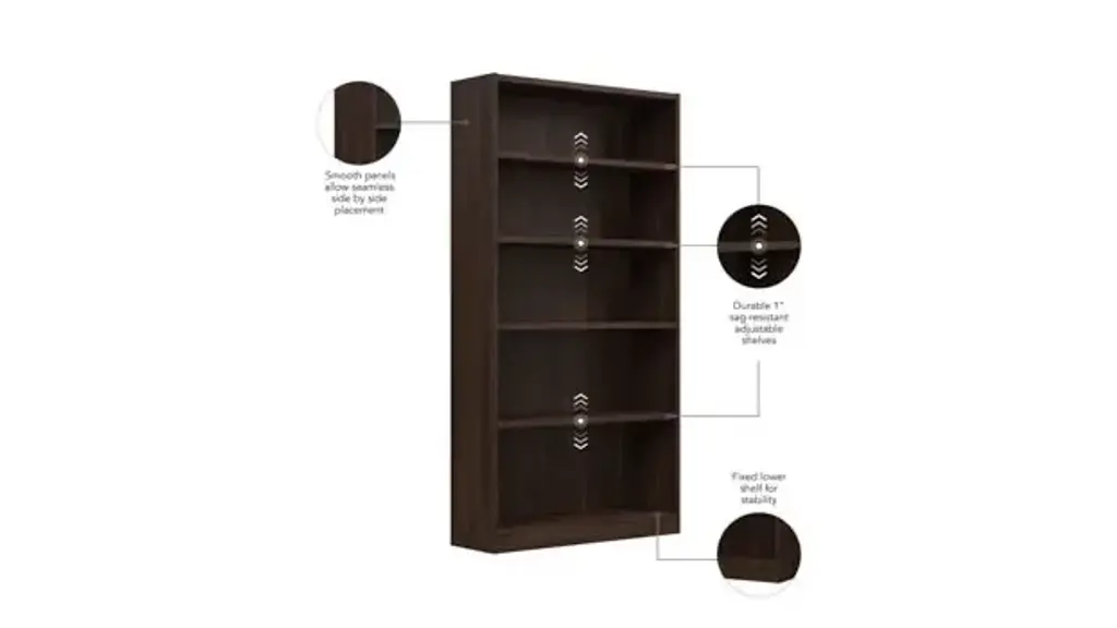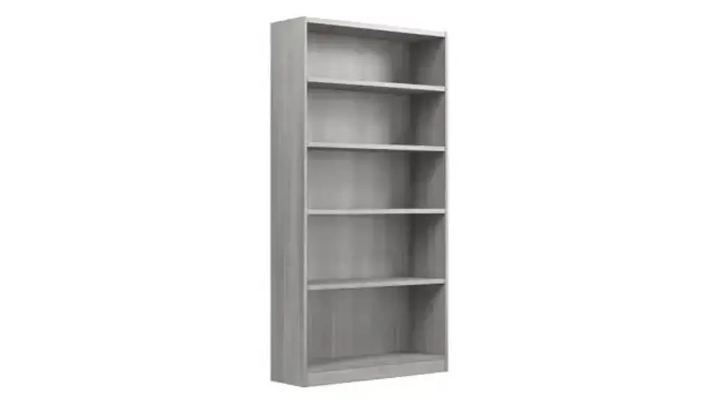 The Bush Furniture Universal Tall 5 Shelf Bookcase provides a versatile organization solution that makes it easy to show off your personal library or brighten up the room with pictures and decorations. Perfect for residential and professional use, this durable 72 inch bookshelf is designed to excel anywhere flexible storage and display capacity is needed. Three adjustable shelves move up and down to accommodate larger items like reference materials, binders and photo albums while two fixed shelves offer added stability. The sturdy one-inch thick shelves have a weight capacity of 50 pounds each, so storing paperback and hardcover books, vinyl records, DVDs or video games is never a problem. Wall attachment hardware is included for family-friendly safety and security in a home office or living room. A variety of finish options allow you to find the perfect look to match with your current decor. This tall 5 tier bookshelf has been meticulously tested to meet or exceed ANSI/BIFMA quality standards for safety and performance. Overall Dimensions: 37.01" W x 11.61" D x 71.46" H. Ships ready for easy assembly.