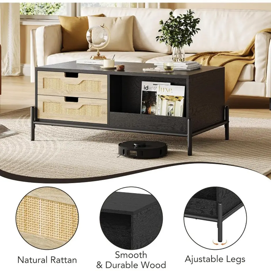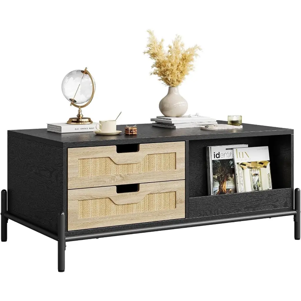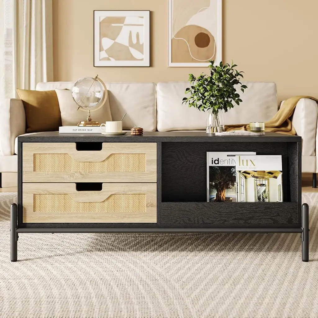 This Rattan Coffee Table features a blend of mid-century modern style and natural rattan hand-woven design. The contrast between the black tabletop and the natural rattan cabinet doors adds a unique boho touch. This wood coffee table effortlessly complements various home styles, making your living room both stylish and elegant.