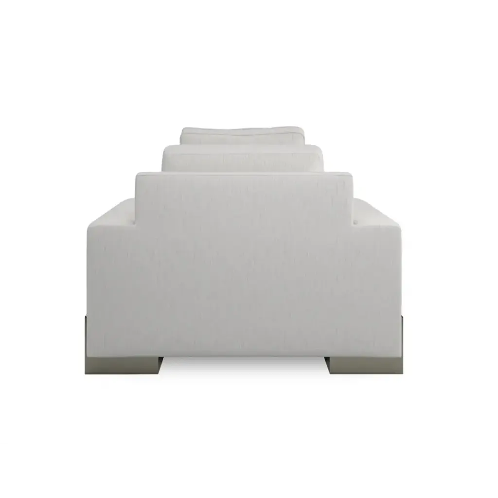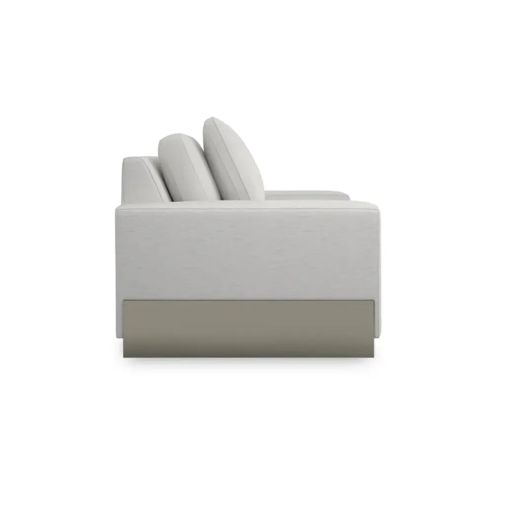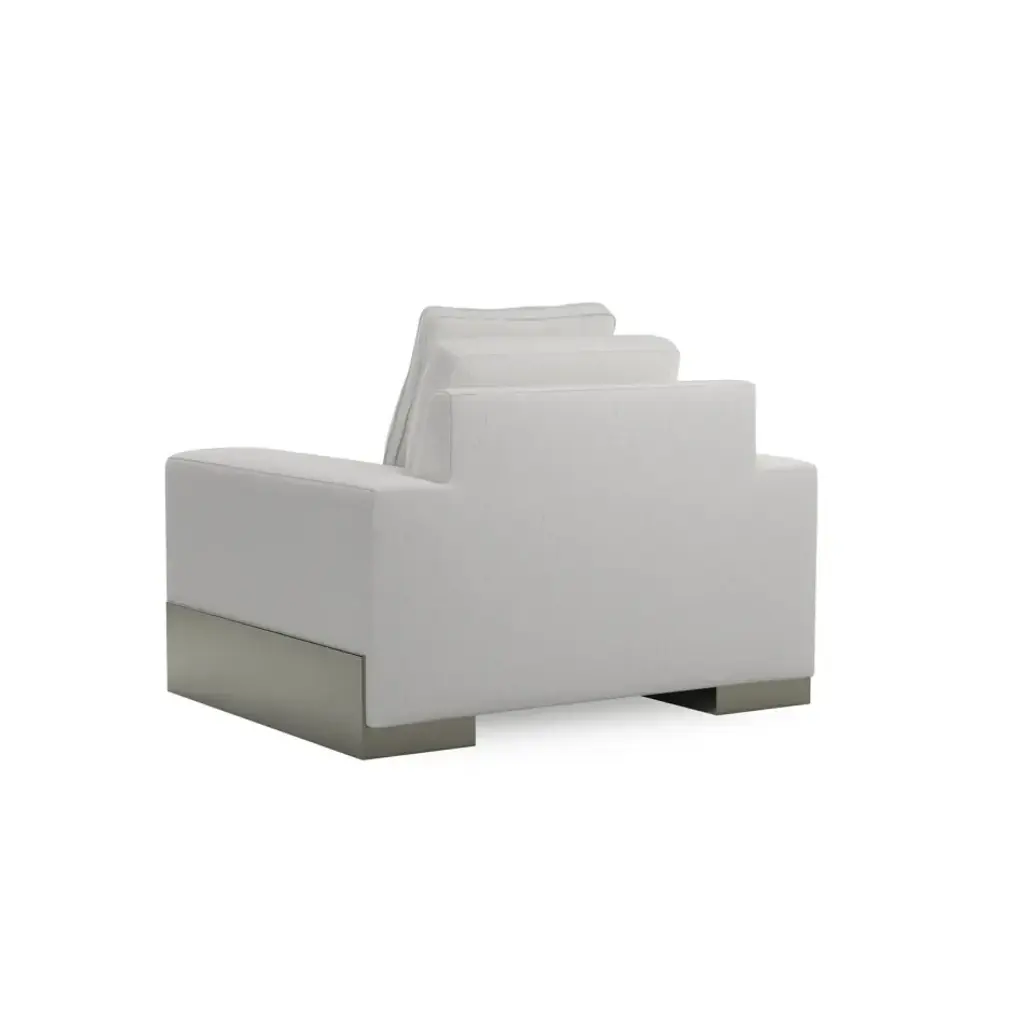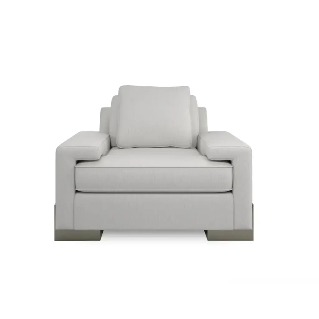 Embodying design without limits, this sublime chair adds rich character to a space. Understated charm emanates comes from its clean, linear profile where its seat cushion nests under a wide shelf-arm. Inspired by modern organic design, it features a neutral, linen-like textured fabric. An angular wood base finished in Pyrite cradles the frame and imparts a finishing touch that grounds its design presence.