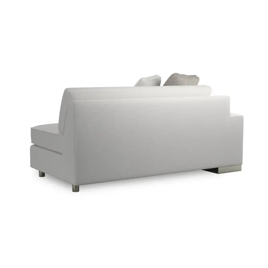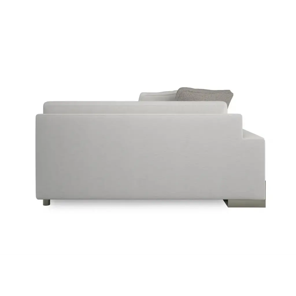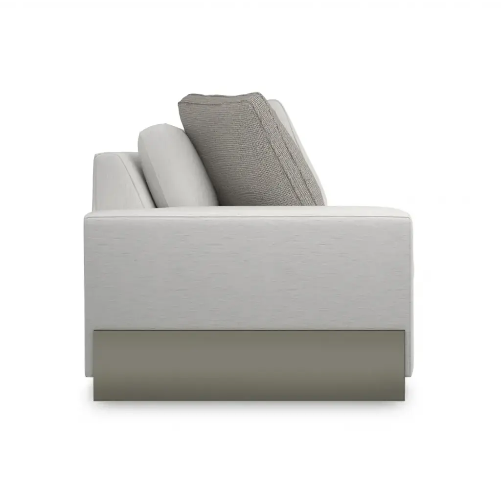 Create a destination in your home with the refined character and comfort of this stunning sectional sofa. Unique by design, its seat cushions nest under a wide shelf-arm creating statement-making style. Destined to be a favorite spot for resting and relaxing, this sectional is upholstered in a neutral, linen-like fabric with a small, modern herringbone pattern. An angular wood base finished in Pyrite cradles the frame and imparts a finishing touch that grounds its design presence.