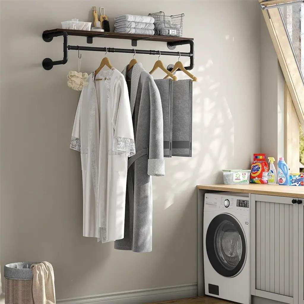 Add a touch of industrial charm to your home decor with this stylish garment rack. Made with sturdy industrial pipe and wood, this rack is perfect for hanging clothes or displaying your favorite items. The wall-mounted design saves space and creates a unique focal point in any room. Versatile and functional, this rack can be used in a variety of settings, from a bedroom or closet to a retail store or boutique. Whether you're looking for a practical storage solution or a decorative accent piece, this garment rack is sure to impress.Feature:Specifications:Package Included: