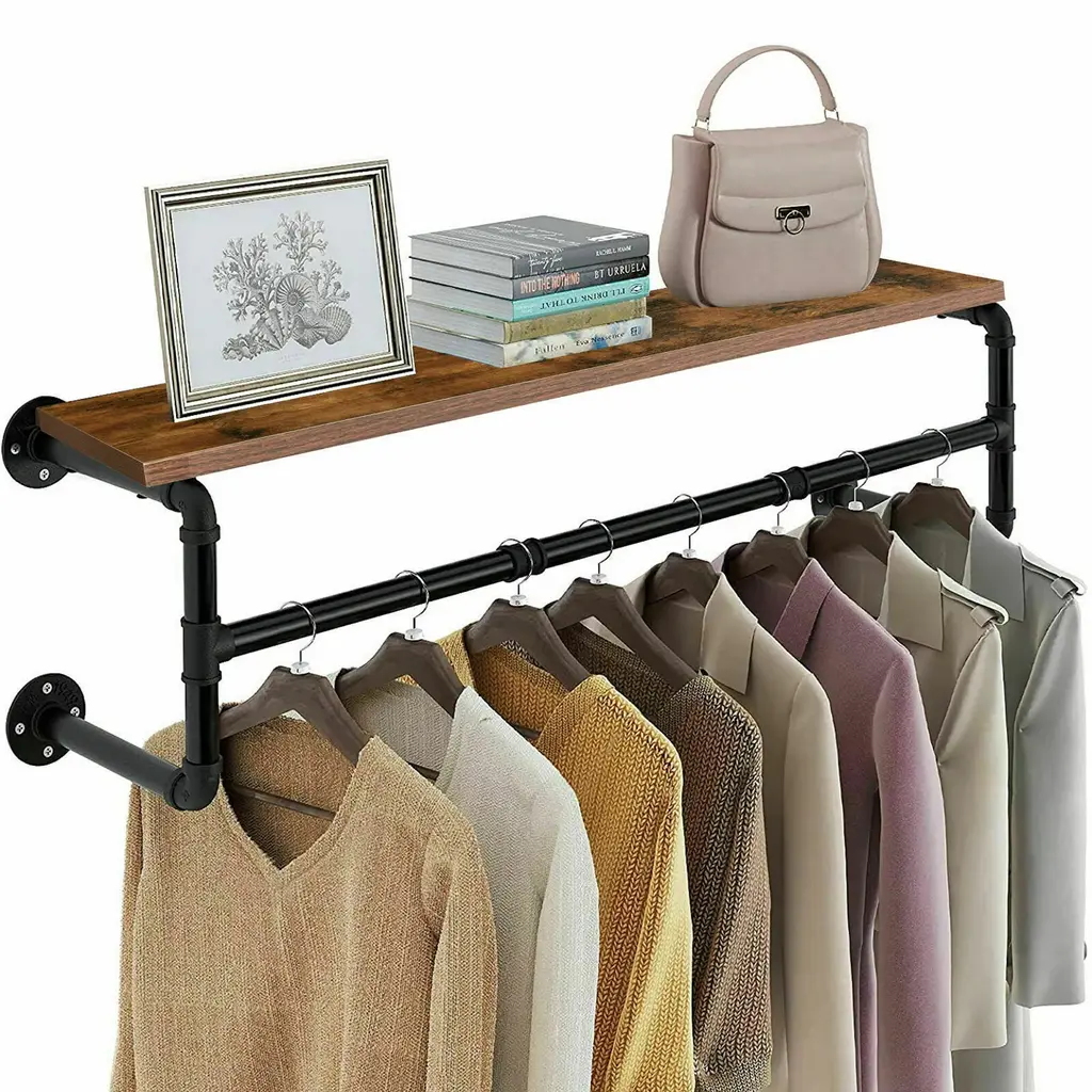 Industrial Pipe Garment Rack With Wood Shelf Wall Mounted Clothing Rack - Brown